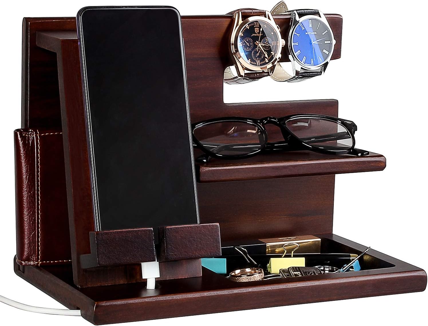 MULTIFUNCTIONAL CHARGING STATION & ORGANIZER:An exclusive house for your personal belongings, like a mobile phone charging station, key holder, wallet stand, watch organizer and glasses station. They will always be there when you need to find them.