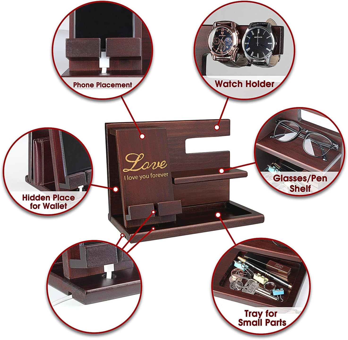 AN IDEAL GIFT: Conveying love, showing concern, is a good choice for gifts. The content engraved on the wooden organizers for men allows users to be very happy every time they see it. Love is connected to each other's feelings through our wooden docking station. Gifts for boyfriend husband. Surprise your husband or boyfriend. Best gift for Anniversary, Valentines, Christmas, Birthday, Father’s day, Graduation.