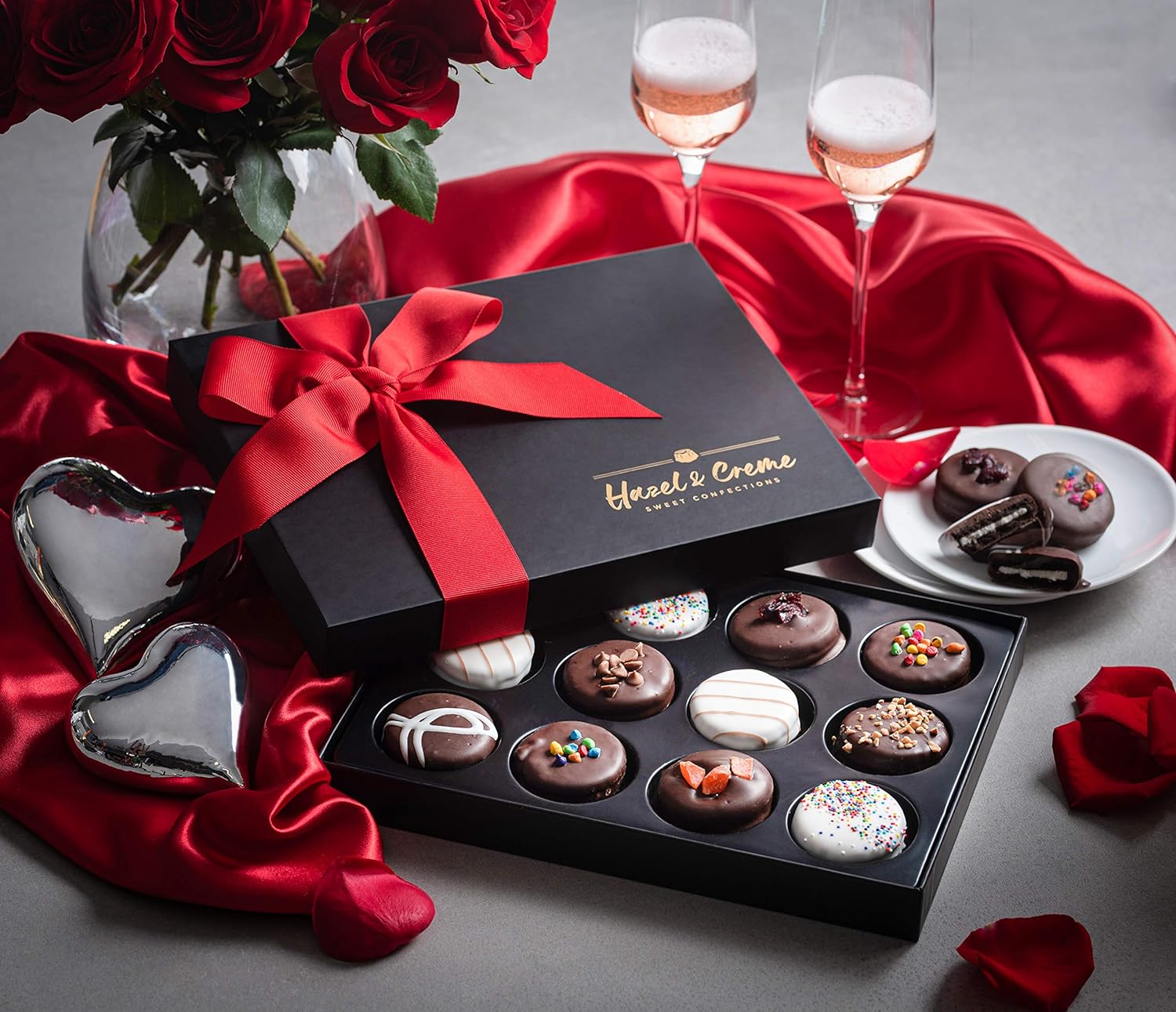 READY TO GIFT: Give the ultimate gift of giving with these beautiful eye popping chocolate gift box. Hazel and Creme chocolates have a delicious combination of flavors and textures. Each cookie is doubled creamed and generously dipped into dark chocolate topped with mouth watering flavorful toppings.