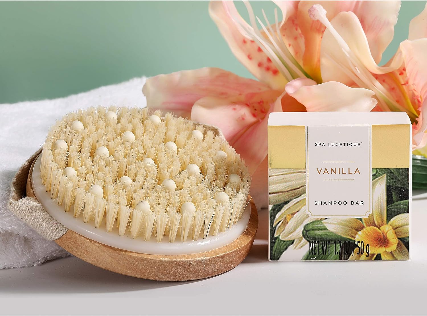 [Pampering 15pc Home Self Care Spa Set] - Bathing with a fragrant and delightful assortment of luxury at-home spa products. Includes: Soap, Shampoo Bar, Vanilla Massage Oil, 2pc Bath Bombs, Shower Gel, Bubble Bath, Body Lotion, Body Scrub, Bath Salt, Bath Puff, Body Brush, Hand Cream, Dry Hair Cap, Handmade Tote Bag.