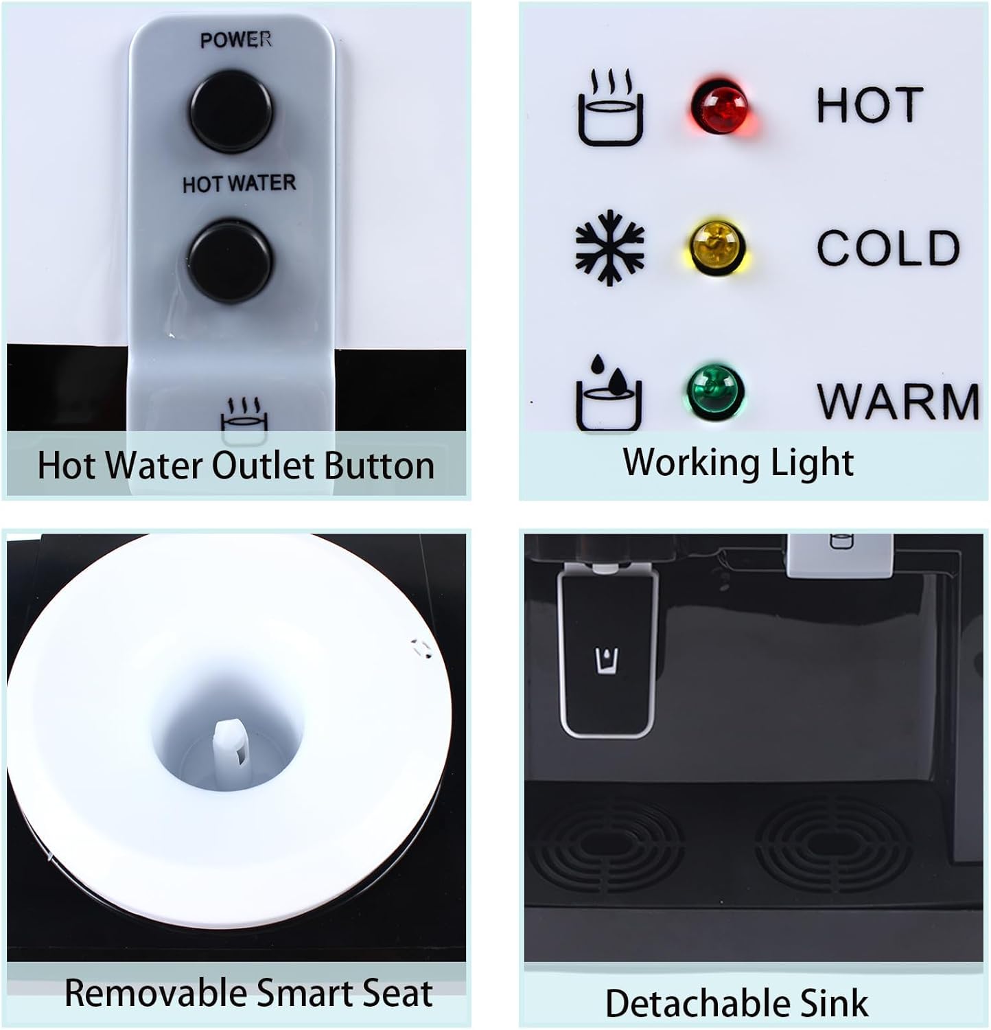 đ§đ§ăRemovable and CleanăOur water cooler is very suitable for various types of drinking buckets, detachable smart seats, large and small buckets can be used, can hold 3.5L, 5L, 10L, 18.9L bottled water, the sink is removable for easy cleaning.