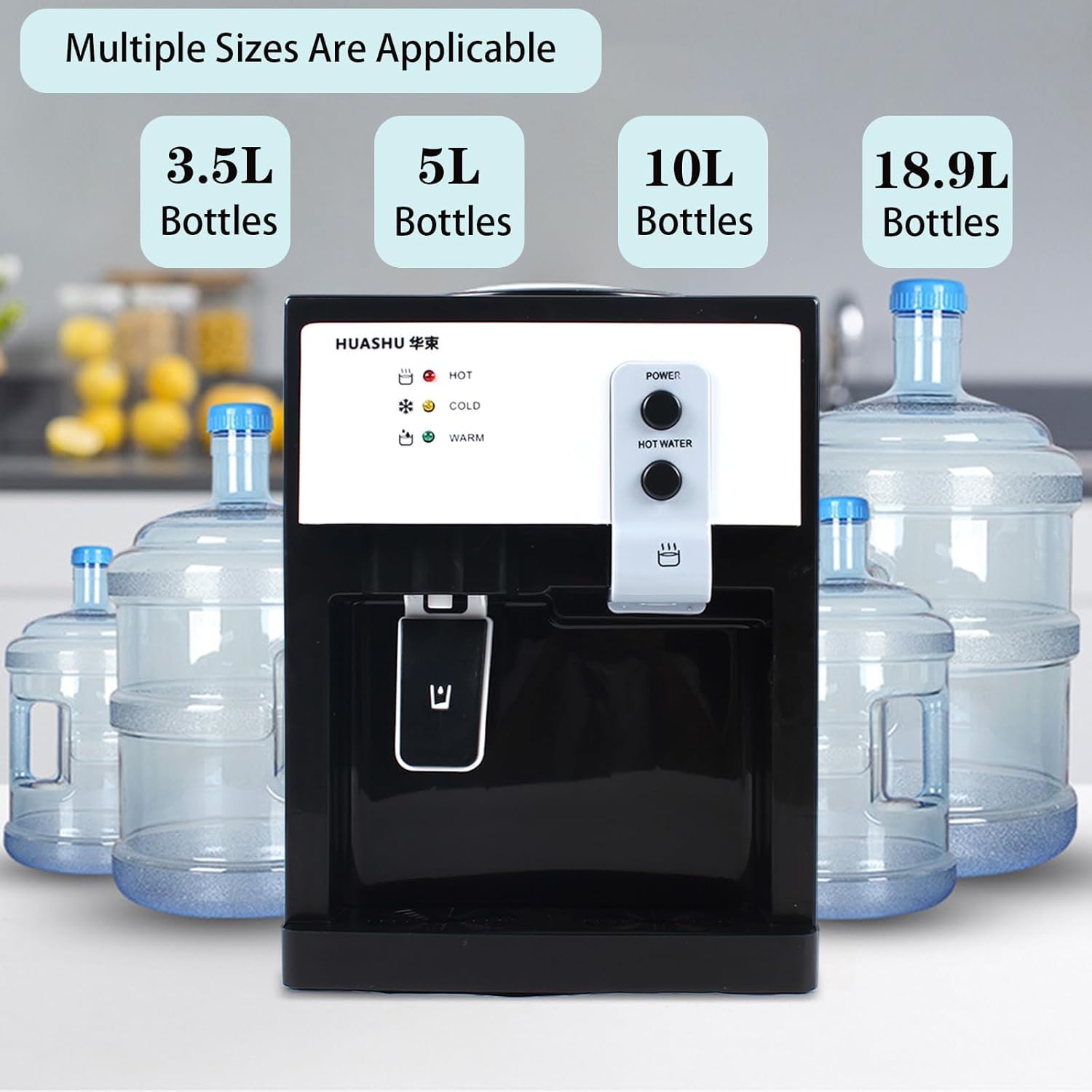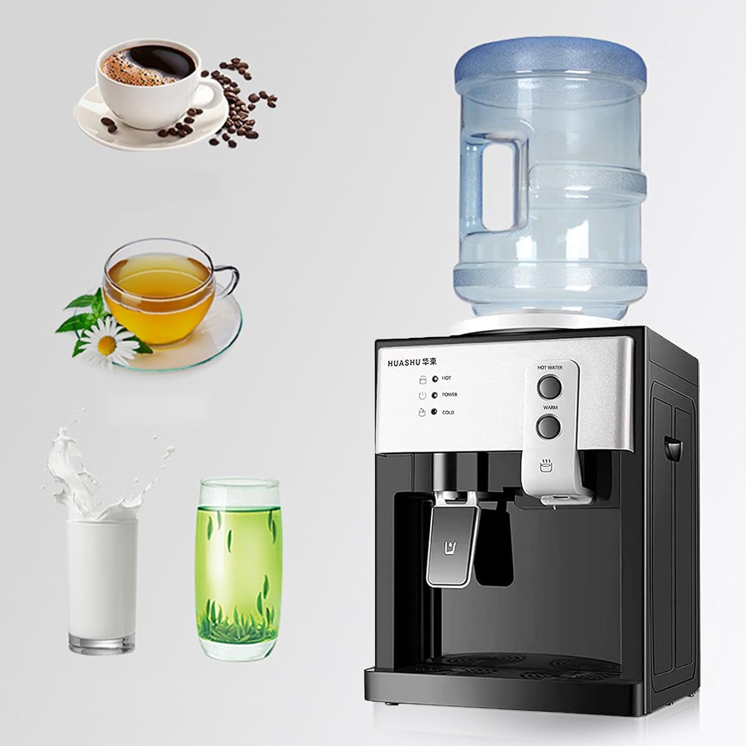 đ§đ§ăFunctional Designă Countertop water dispenser, with a capacity of 5 gallons of water, with ice-hot function, can be used in all seasons, rapid heating, automatic temperature control, multi-functional base, easy to use, push the cup to dispense water, and one-handed operation can easily complete the water dispensing.