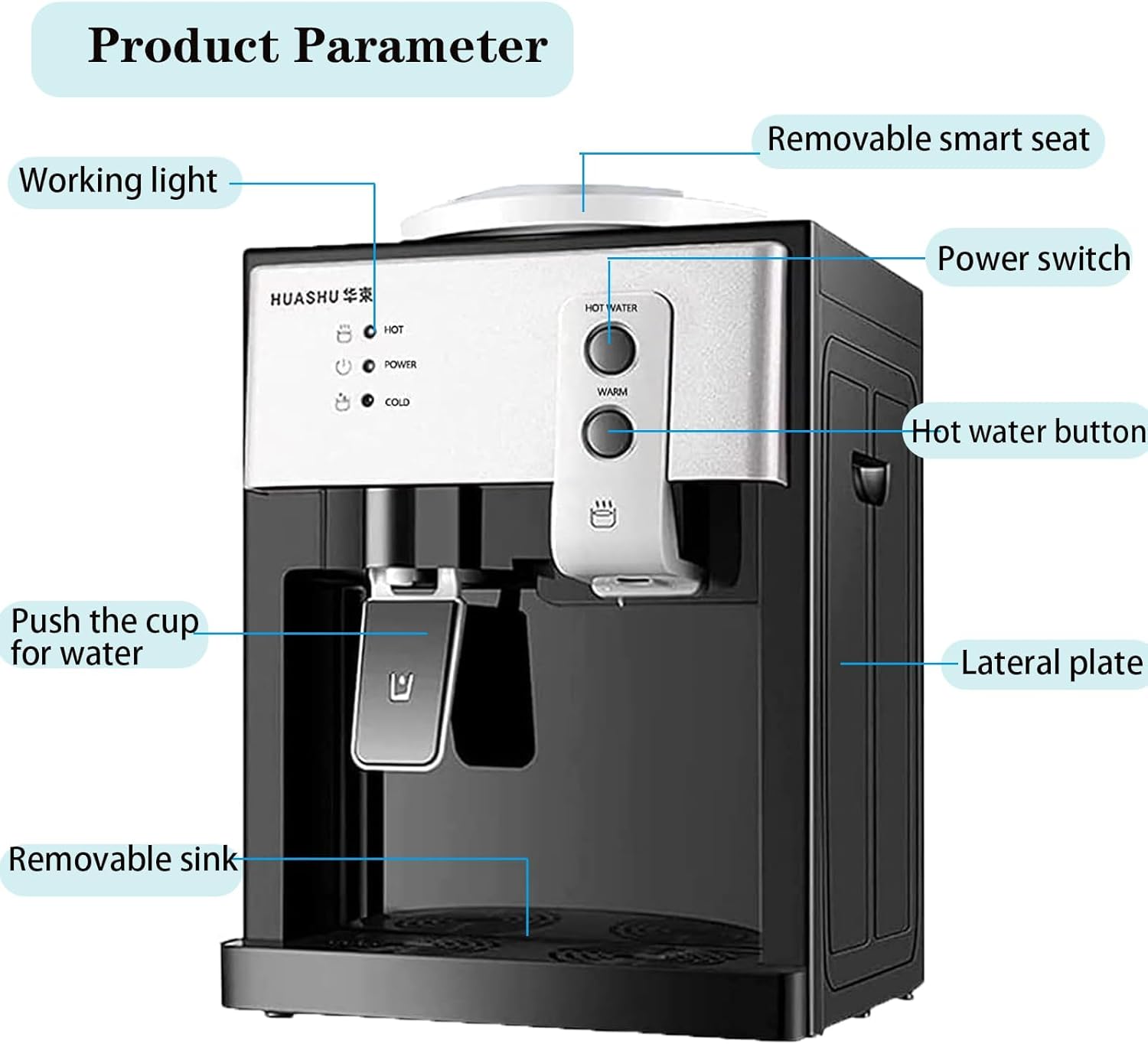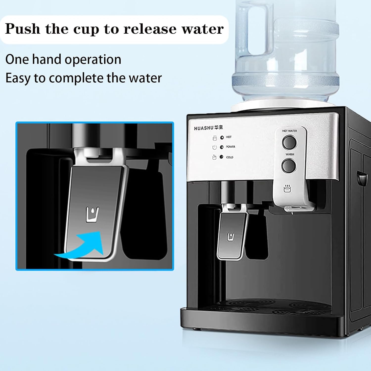 đ§đ§ăHot and Cold WaterăElectric water dispenser countertop is convenient to design, and the detachable sink is easy to clean. Heating capacity:5L/hâ„95â,cooling water volume:1L/hâ€8â,using a convenient push cup water outlet design,one-handed operation can easily complete the water outlet.The water dispenser does not contain bottled water.