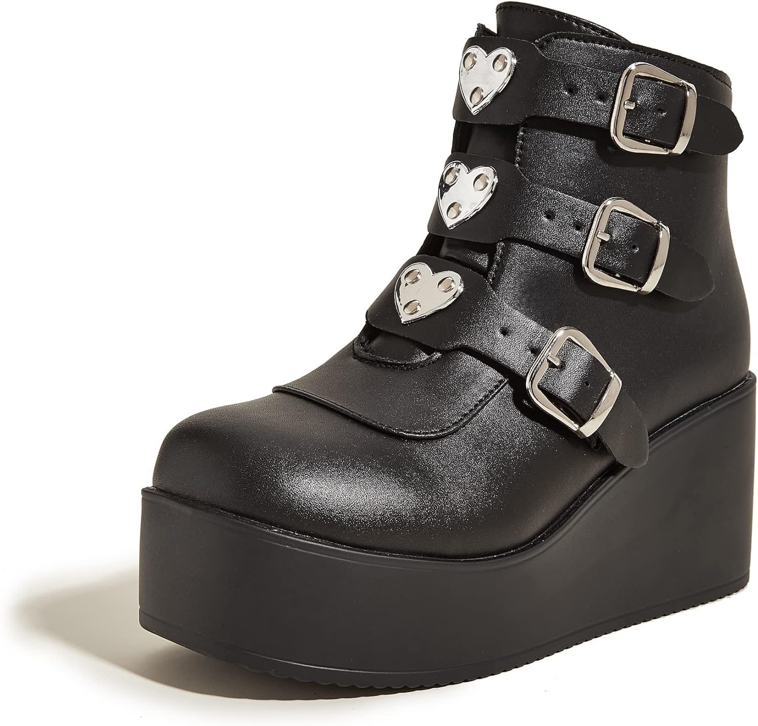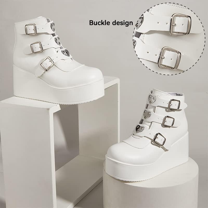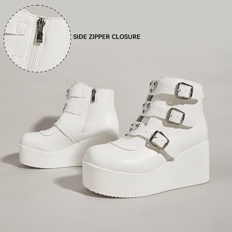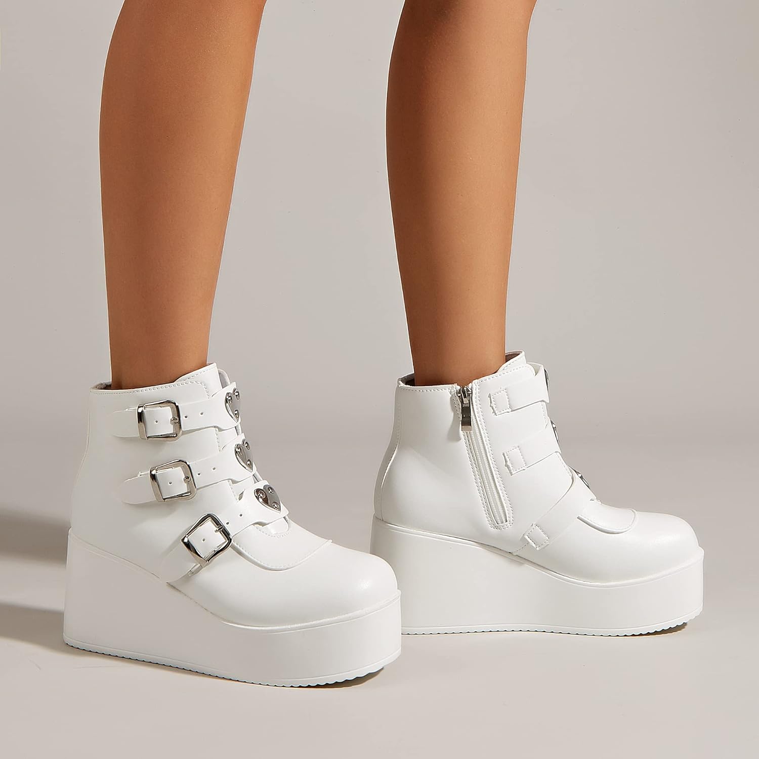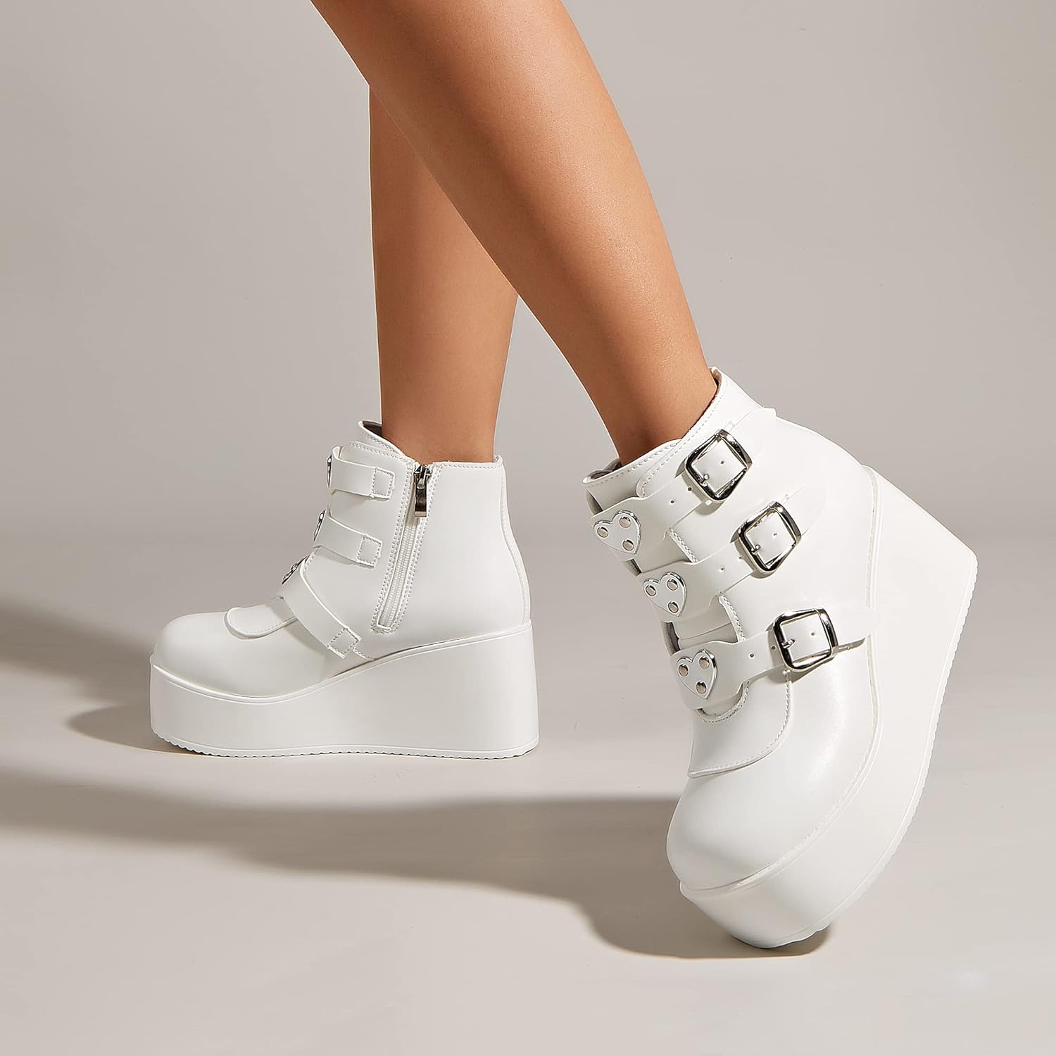 LUCKY STEP Women Platform Chunky Ankle Boots - Round Toe Zipper Wedges High Heels Rave Buckle Thick Sole Goth Booties