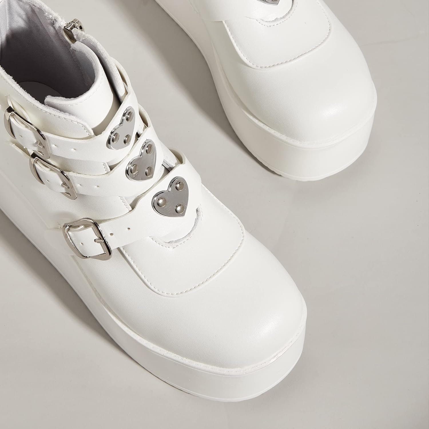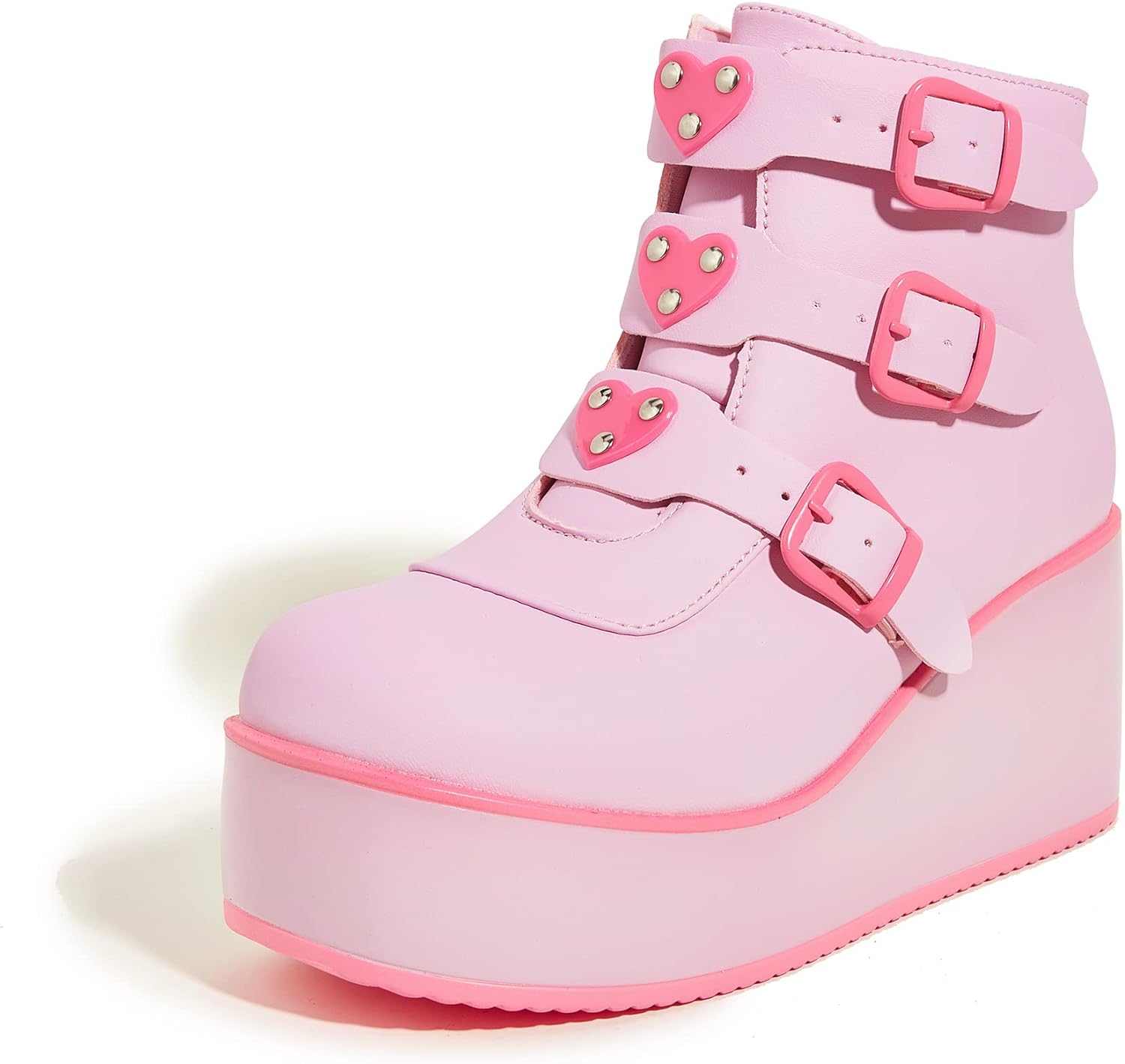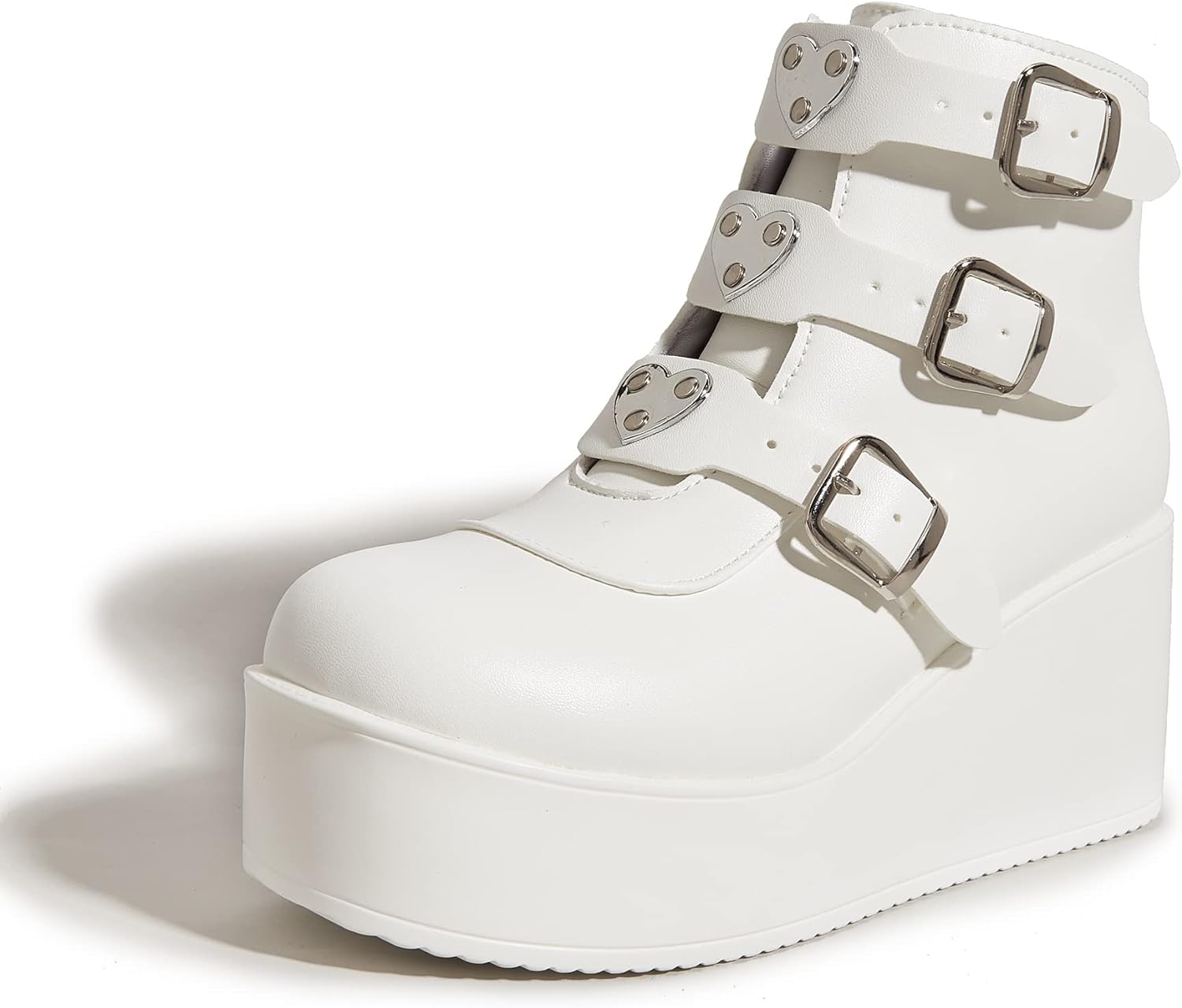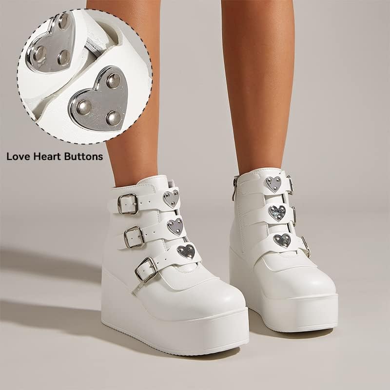 LUCKY STEP Women Platform Chunky Ankle Boots - Round Toe Zipper Wedges High Heels Rave Buckle Thick Sole Goth Booties