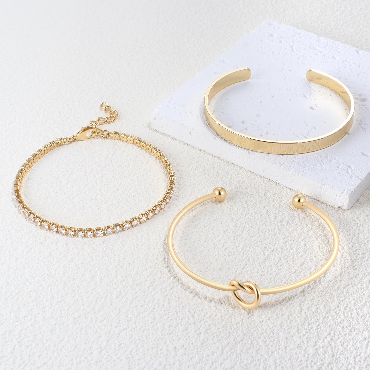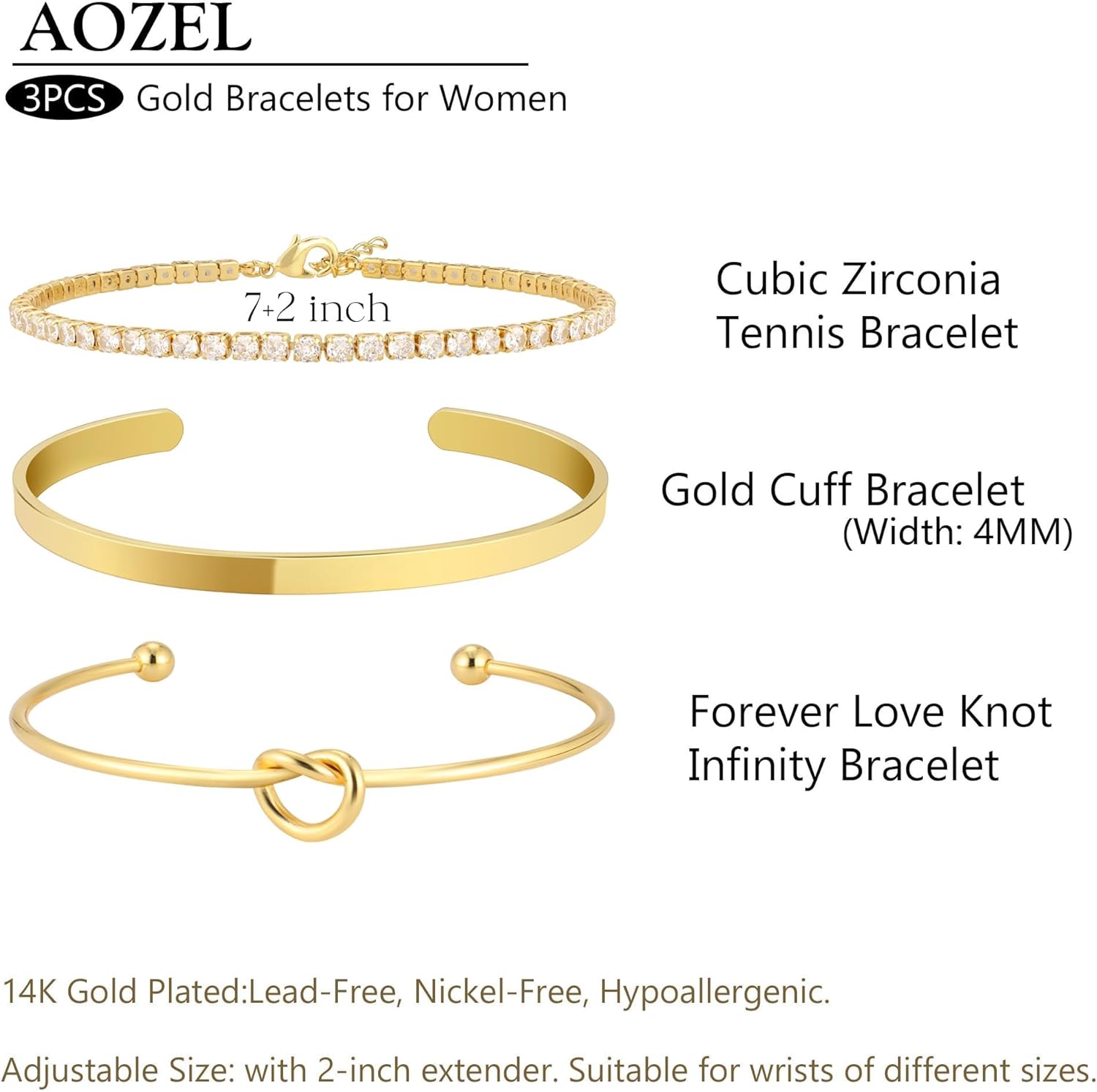 - 3Pcs Gold Bracelet Set: Mix and match these fashion gold bracelets for women non tarnish to create your own unique look. Aozel offers you three styles of waterproof bracelets such as Love Knot Cuff Bracelet/Thin Cuff Bracelet/Tennis Bracelet. You can wear dainty bangle bracelets for women individually or stack together.