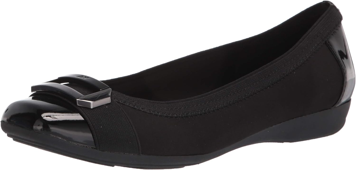 - Brand: Anne Klein Closure type: Pull On Heel type: Kitten Heel Outer material: Fabric Special feature: Elastic Style: Uplift Flat