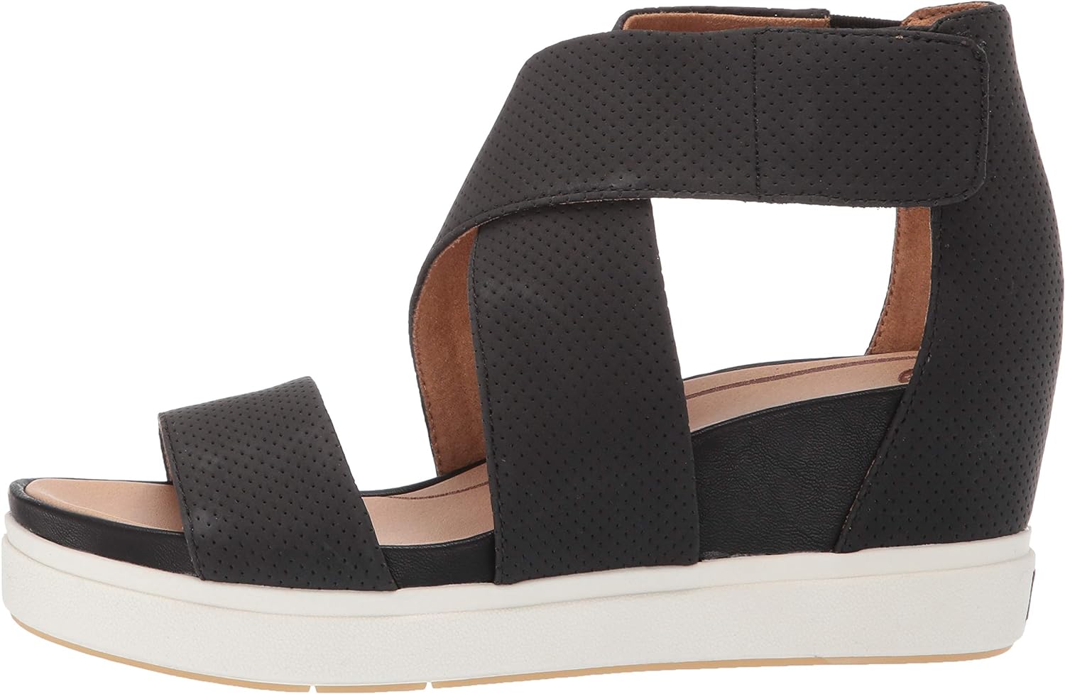 A standout sandal you’ll be loving all season long. Wear this sporty and contemporary style to lift up your look. Microfiber or faux leather upper. Open toe. Adjustable ankle strap with hook-and-loop closure. Strappy silhouette. Inside hidden gore for extra flexibility. Anatomical contoured insole. Scored outsole for extra flexibility. 2 and 1/2 inch integrated wedge heel.