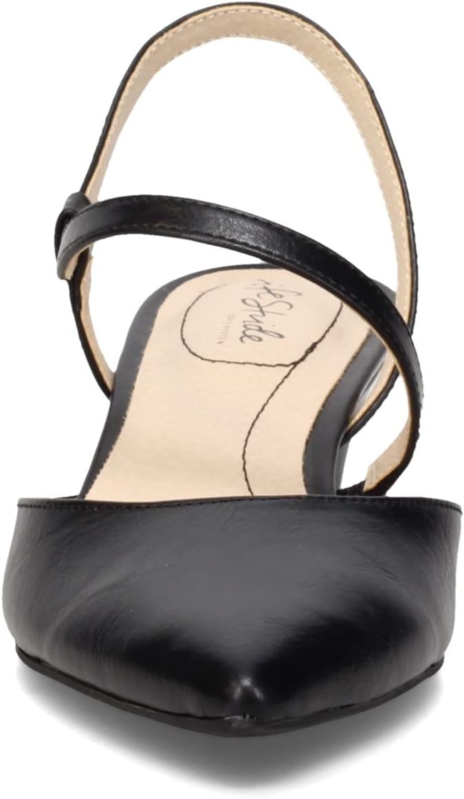 - Faux leather or fabric upper with a pointed toe, slip-on fit, and crisscross strap