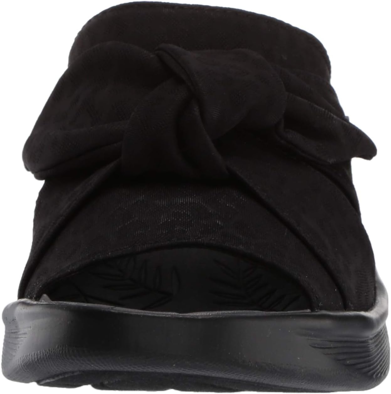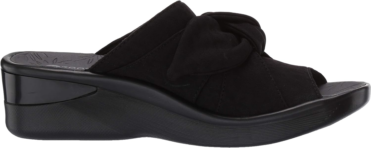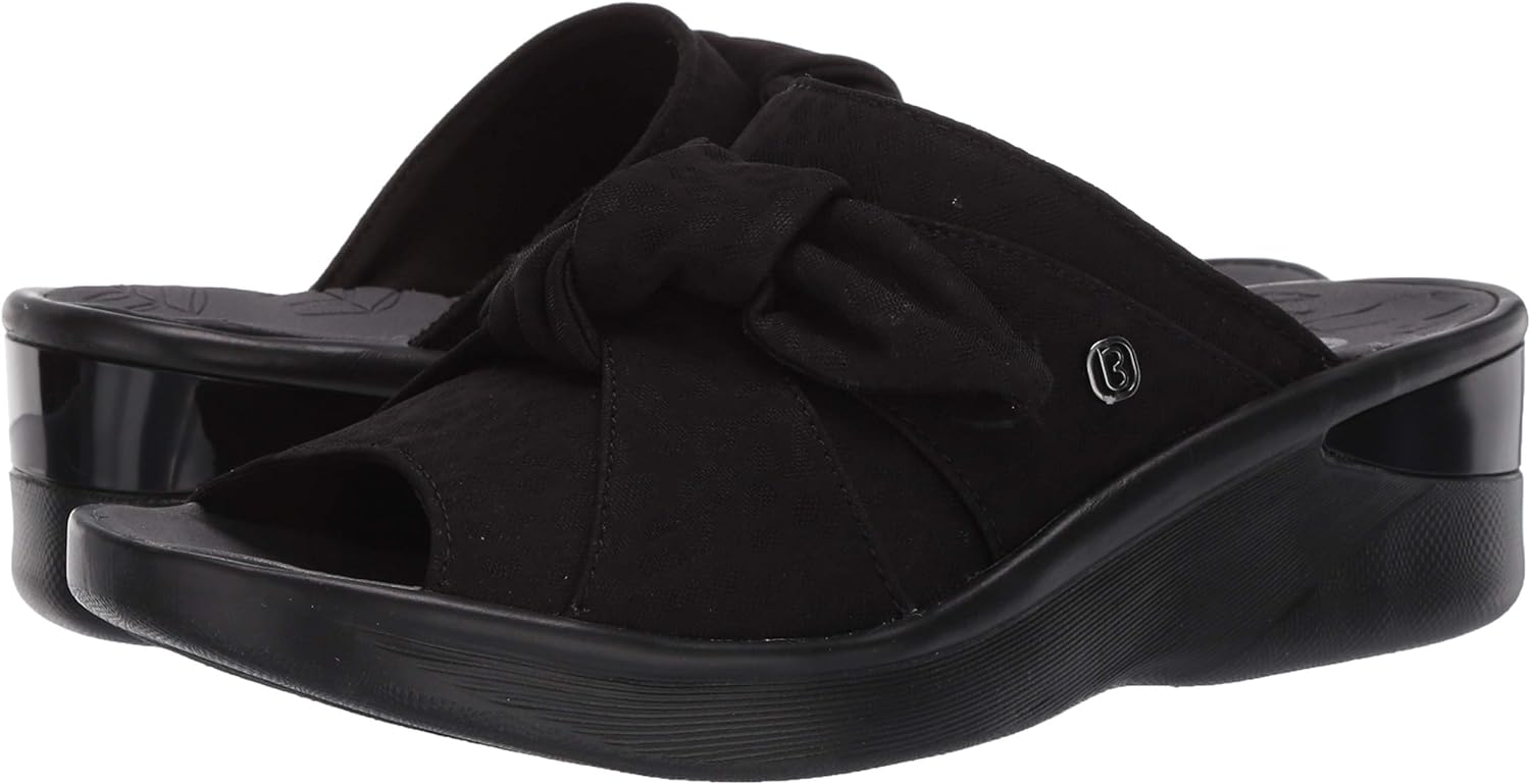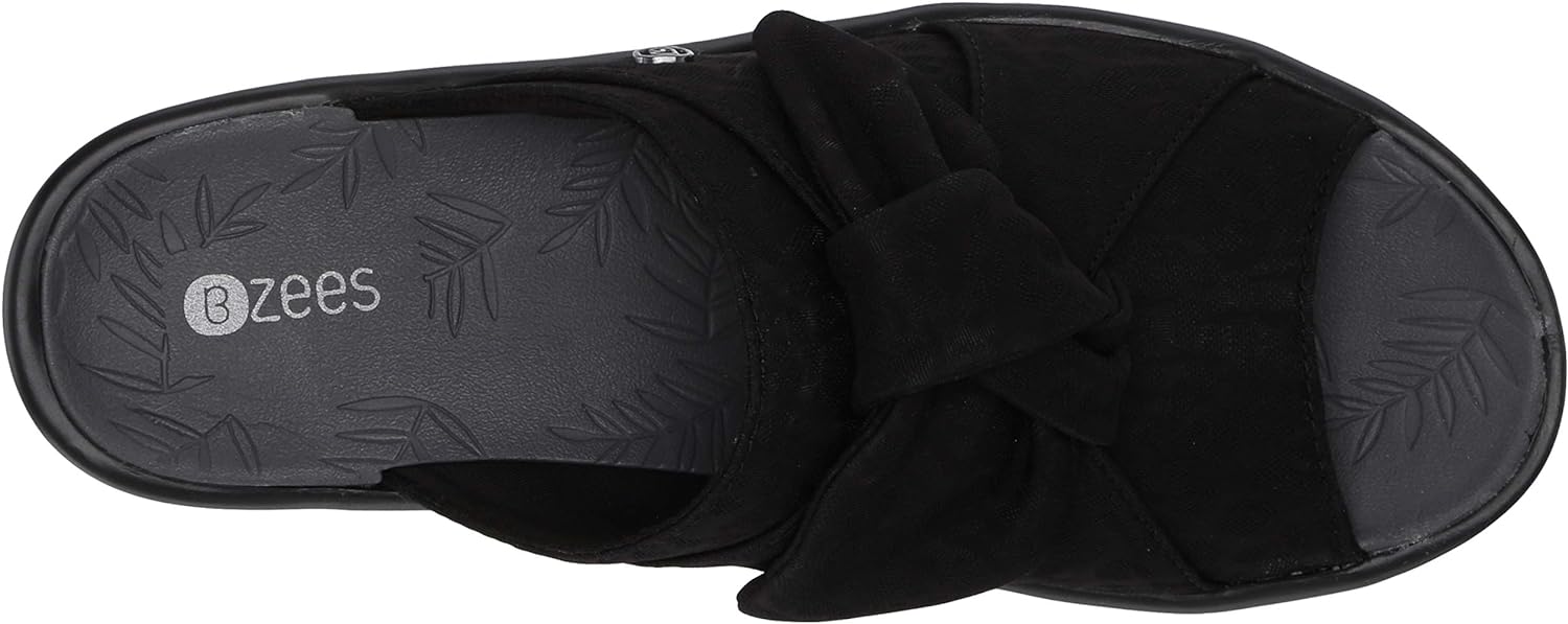 You won't be able to stop smiling every time you slip on this crazy-comfy slide sandal. Stretch fabric upper in a casual sandal style with an open toe. Knotted bow detail. Slip-on fit. BZees cloud technology: welcome to cloud 9Dynamic stretch uppers: free and natural movement is finally here. Designed so you'll feel weightless, energized and free. and odor control technology. Free foam footbeds: your feet need beds just as much as the rest of your body does. Air-infused outsoles: you’ll feel like you’re walking on, well, you get the idea. Machine washable: toss ‘em in the wash and you’re good to go. 2 inch heel.