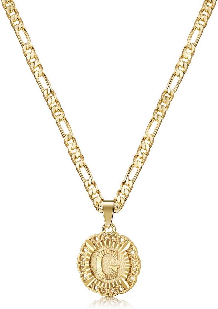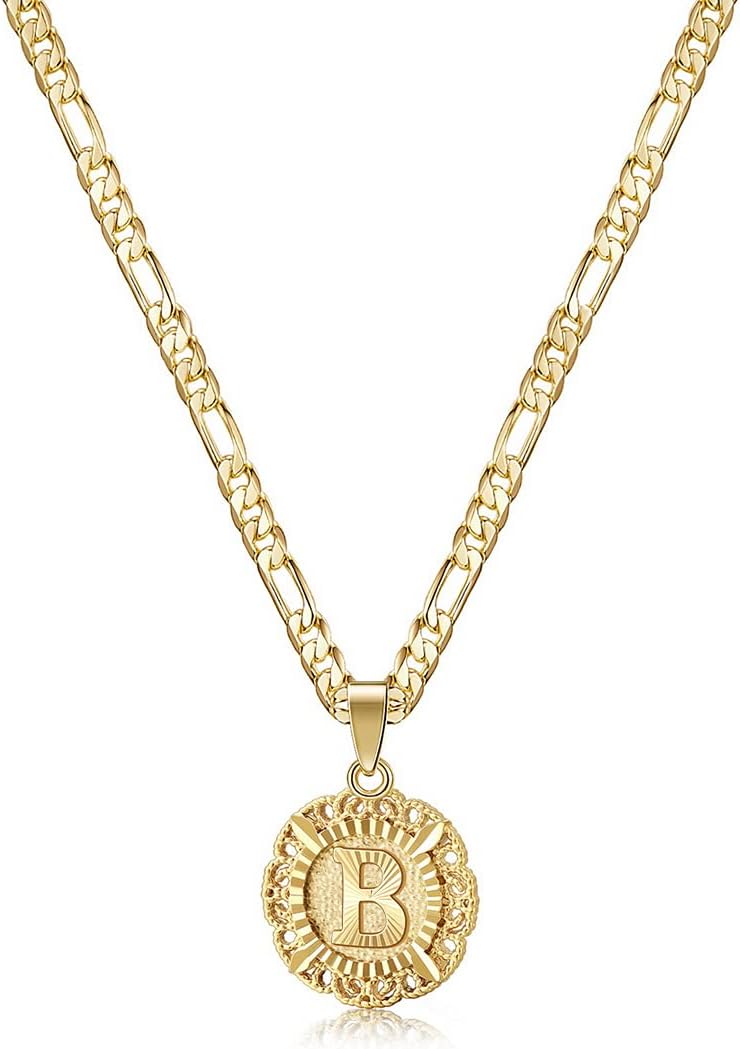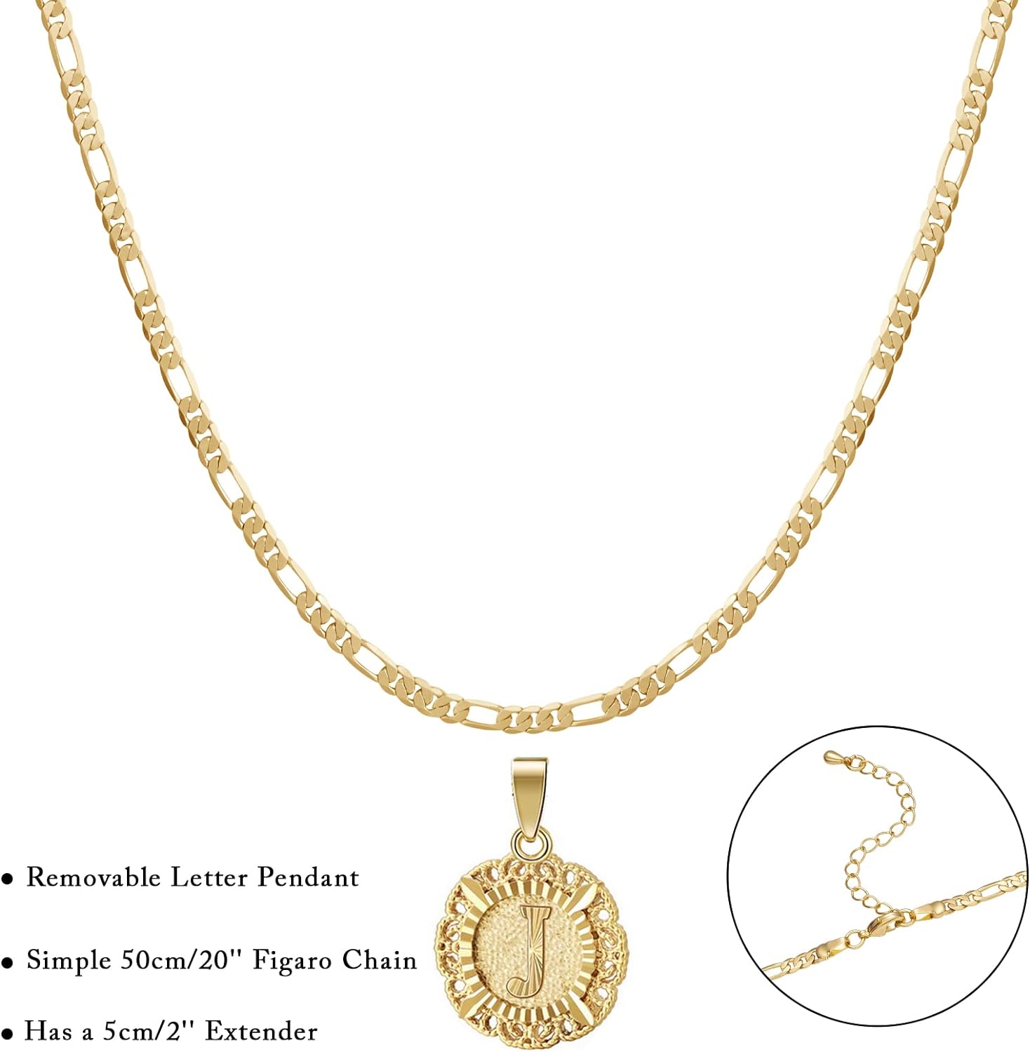 KissYan Initial Necklace For Women Girl,14K Gold Plated Round Letter Pendant Necklace Capital Monogram Necklace Alhpabets from A-Z Figaro Chain Necklace…