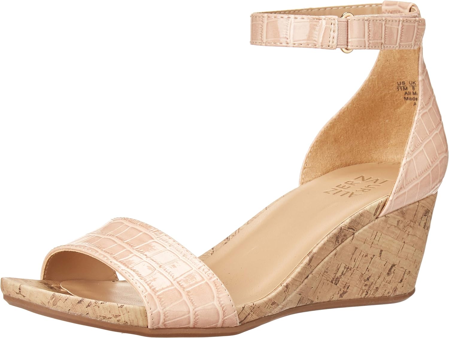 - Fabric and synthetic upper in a dress wedge sandal style with an open toe