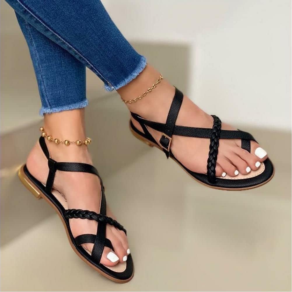 WEDFGX Summer Women Flat Sandals Fashion Buckle Strap Open Toe Beach Casual Women'S Shoes Flats Pus Size Ladies Sandals, black