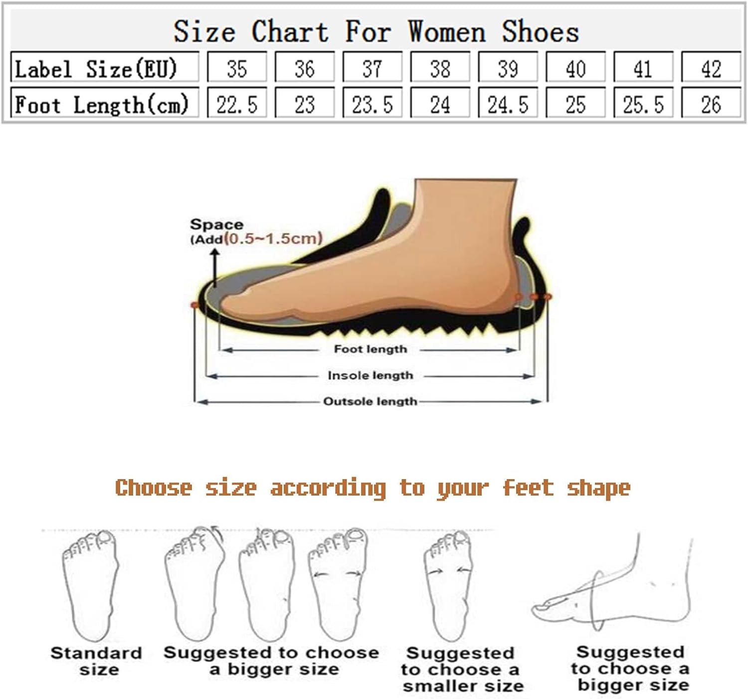 - Size Choice: Standard shoe size design, in order to ensure the foot has a comfortable space in the shoe, you can consider choosing one size up