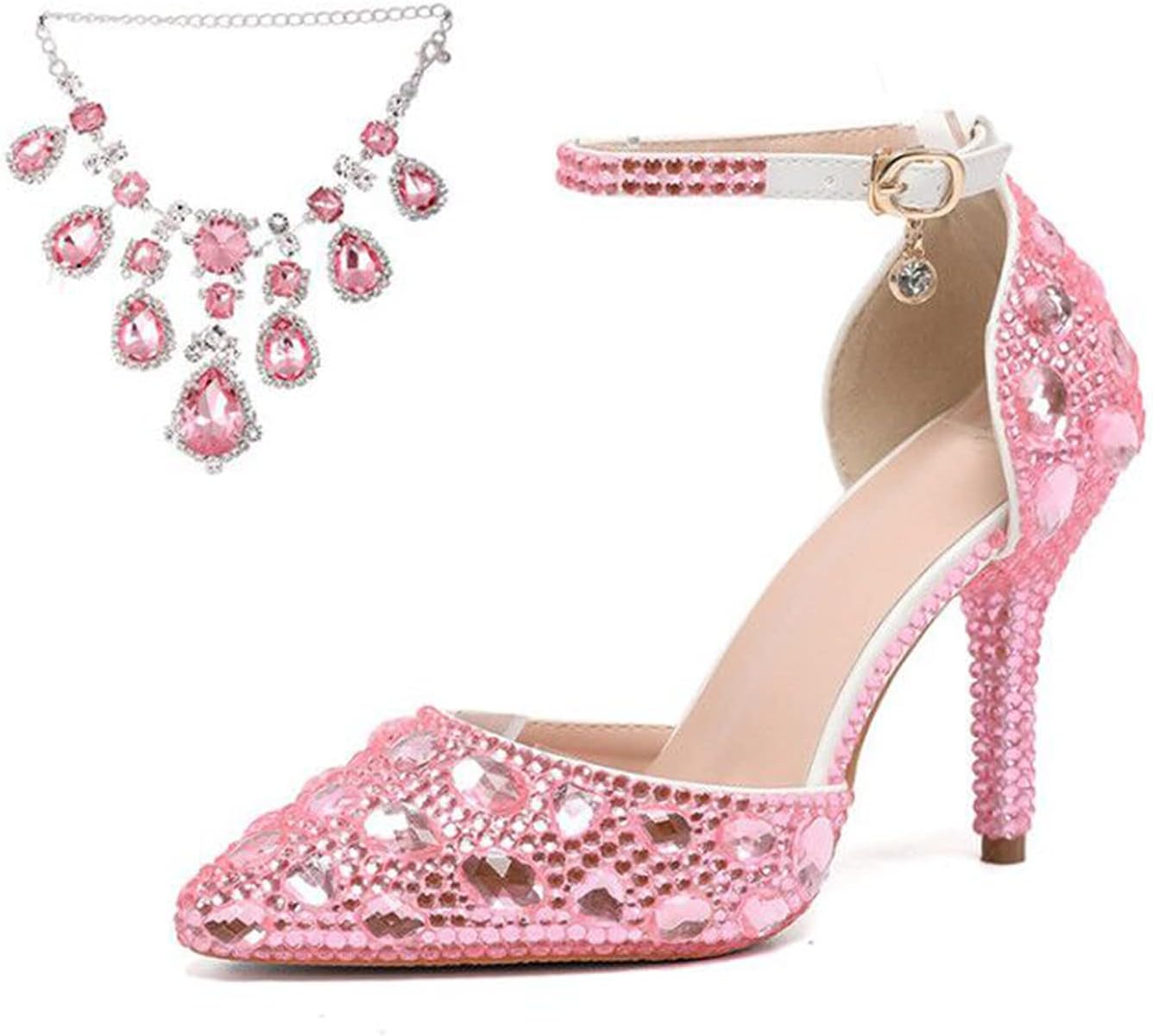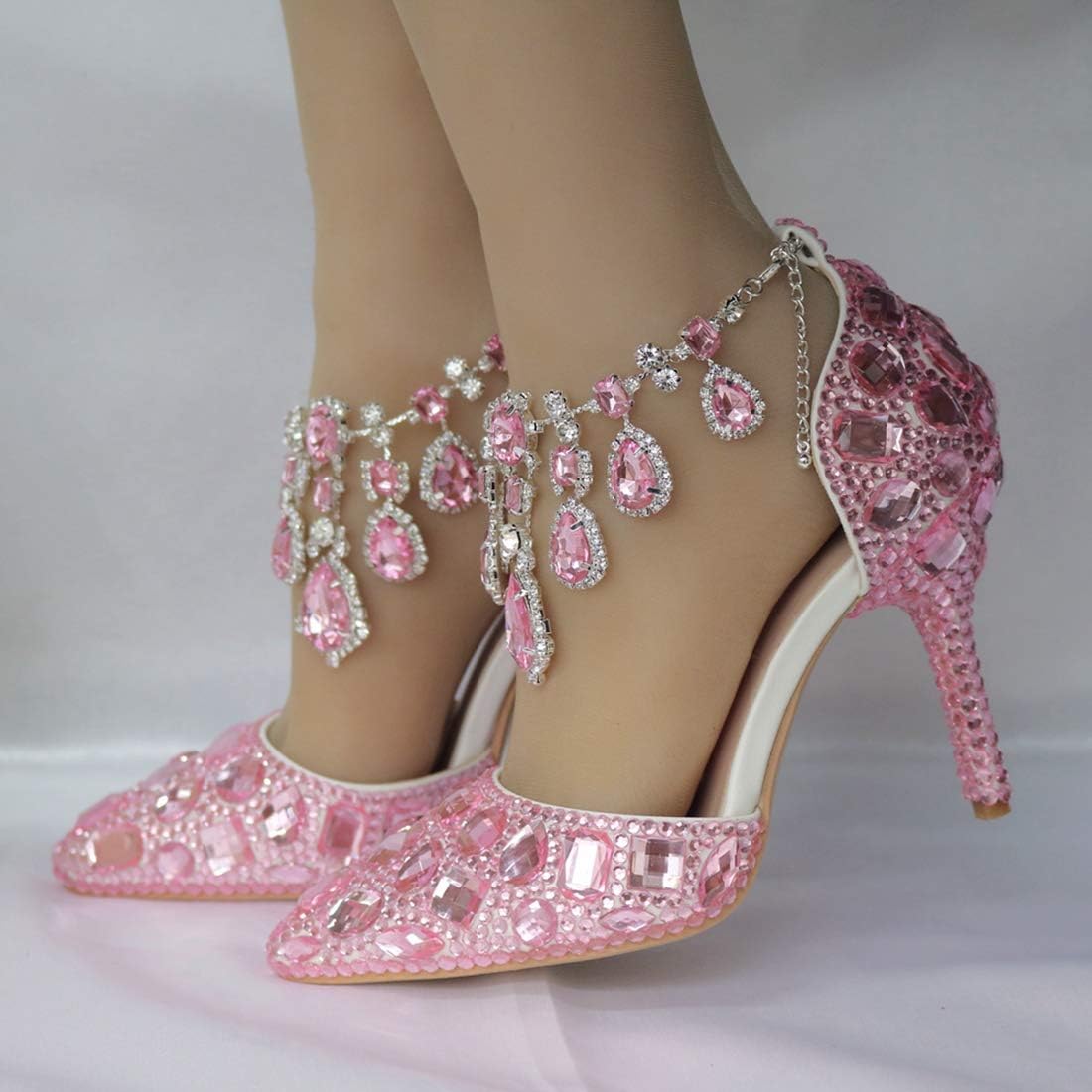 MINITOO Women's Rhinestone Wedding Shoes High Heel Party Pumps Ankle Chain Pink UK 7