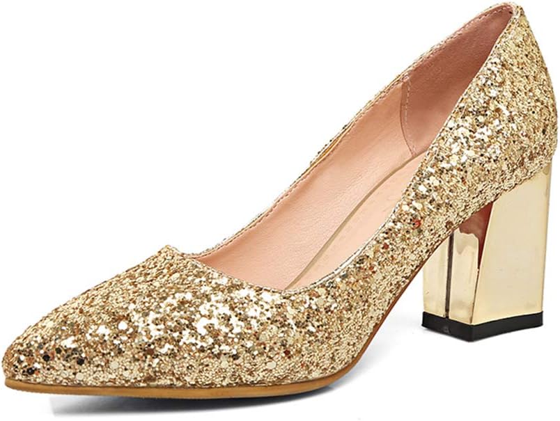 Women's Sparkling Glitter Chunky Heel Closed Toe Pumps Comfortable Mid Block Heel Slip-on Classic Party Dress Shoes