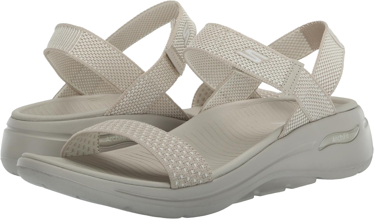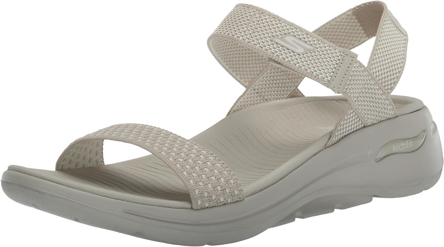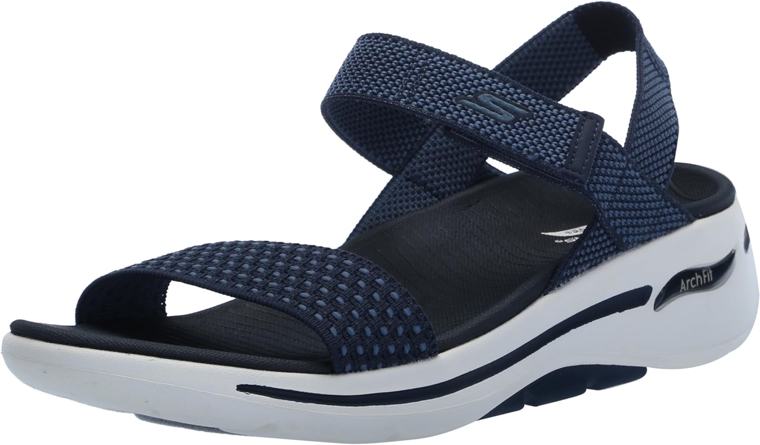 Walk in supported comfort and cool style with the Skechers GO WALK Arch Fit(R) Sandals. This ankle strap slide comfort sandal features a textured solid color mesh fabric upper with a supportive Arch Fit(R) contoured footbed, lightweight, ULTRA GO(R) cushioning and Comfort Pillars(R) for added support. Construction Solid colored lightly textured mesh fabric upper Ankle strap slide river style sandal design Adjustable hook and loop closure at instep strap Durable dual-density traction outsole for stability Machine washable 1 3/4-inch heel Skechers(R) and Arch Fit(R) logo details Details Patented Skechers Arch Fit(R) contoured footbed with podiatrist-certified arch support Podiatrist-designed shape developed with 20 years of data and 120,000 unweighted foot scans Contoured footbed helps mold to your foot to reduce shock and increase weight dispersion Lightweight, responsive ULTRA GO(R) cushioning High-rebound Comfort Pillars(R) for added support
