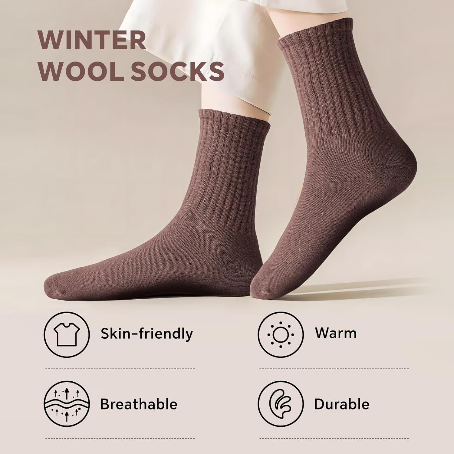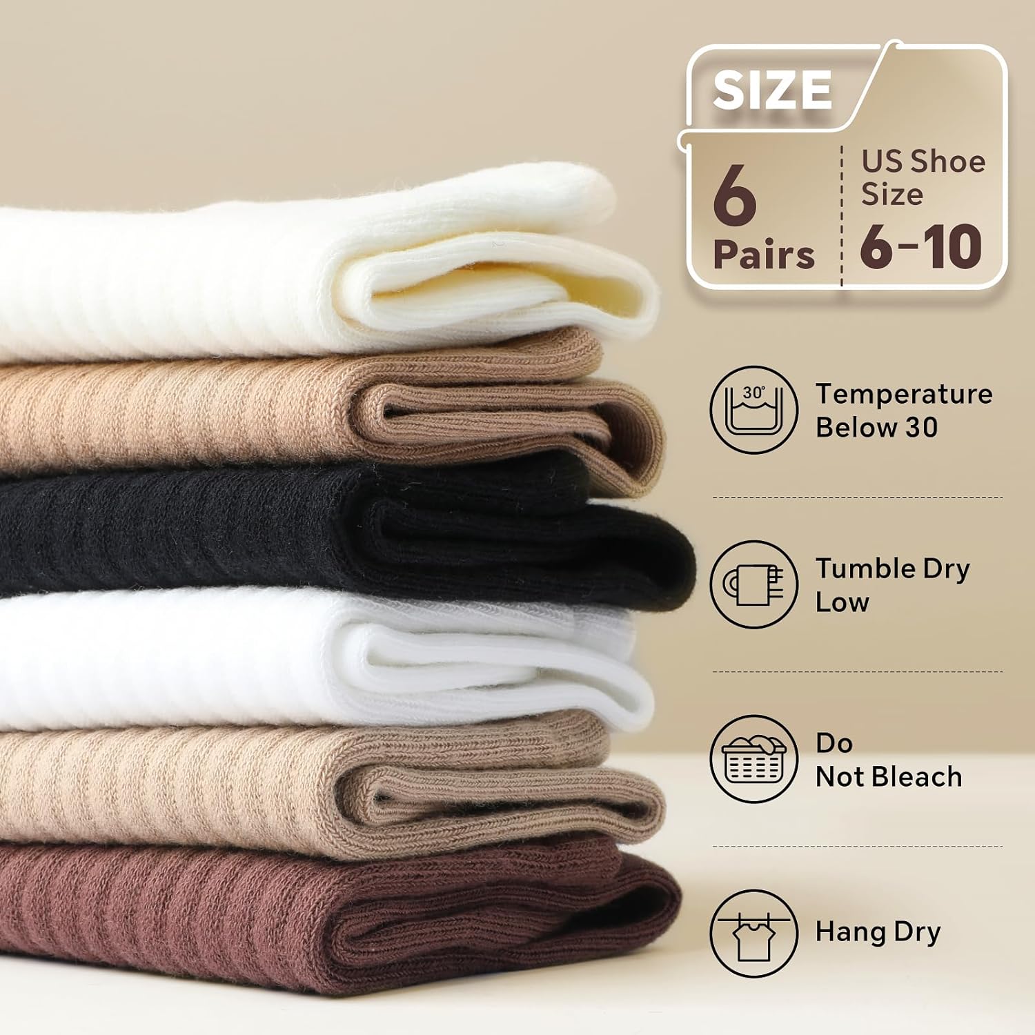 Color: Black,Brown,Light Coffee,Khaki,Cream,White Fabric: 80%Cotton + 17%Polyester + 3%Spandex Cotton Material: Soft, Comfortable, Skin-Friendly Size: US Shoe Size 9-12 Features: Thickened Breathable Elastic Non-Slip Care Instruction: Higher percentage of cotton fiber is used for better comfortability, cotton socks always get shrink when heated, thus we suggest washing with cold water and air dry, machine dry should be avoided.