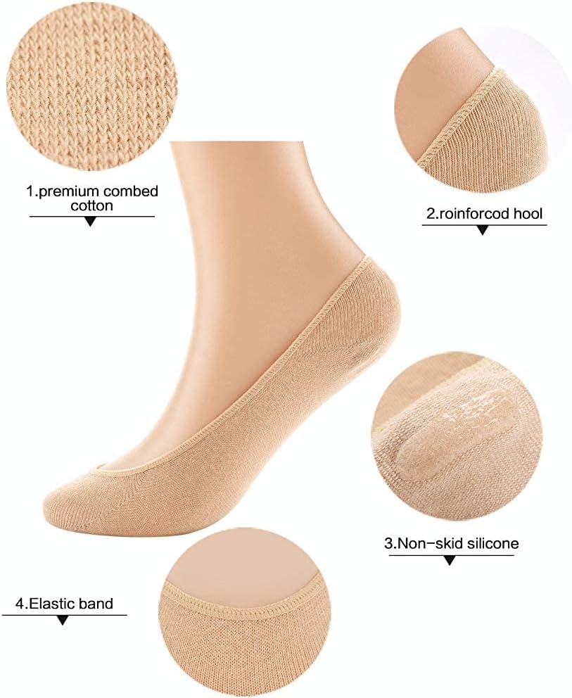 Designed to be invisible flats socks, it gives a sockless appearance after wearing with shoes. Wear our ultra-low cut liners with your different shoes, it's comfortable ,elegant with good practicality. And these black, white, beige and grey coloured socks are perfect for your most favourite shoes, flats, high heels, dance and sports shoes and canvas shoes, etc. Non-slip design - With the silicone pad at the sock's back heel, to avoid slipping off even long time walking. Made of premium cotton - soft, breathable, durable. We do believe these socks are what you have been looking for!