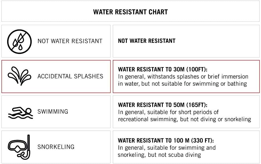 - Water-resistant to 3 bar (30 meters/100 feet), withstands rain and splashes of water, but not showering or submersion