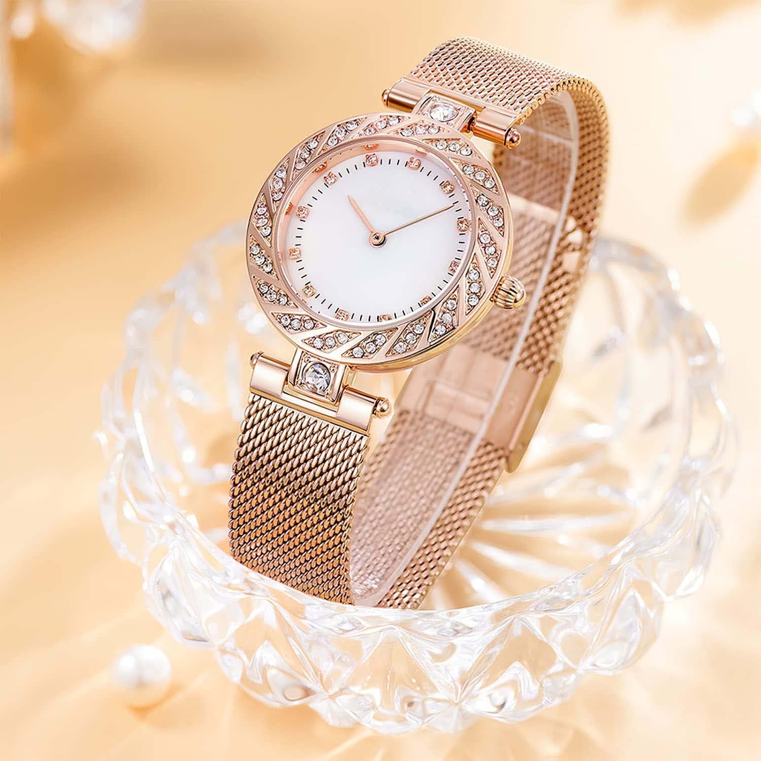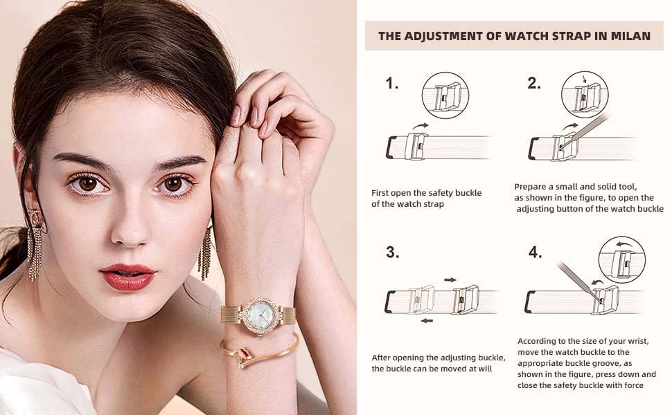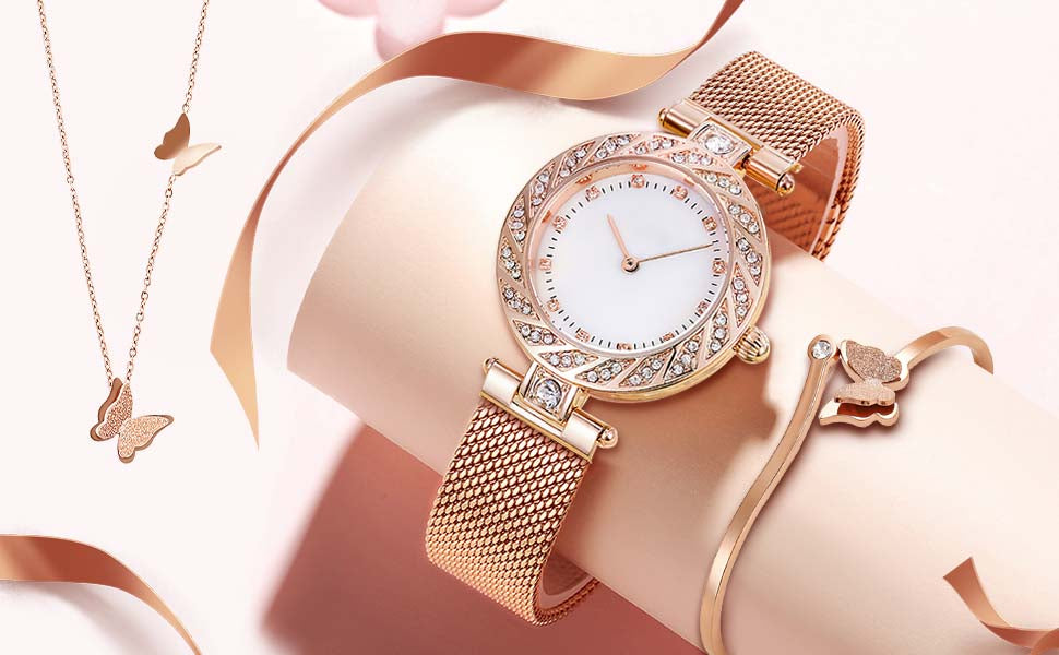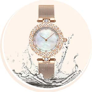- đ -ăCOMFORTABLE & ELEGANT STRAPăRose-gold tone stainless steel bracelets easily matches with your daily dress; scratch-resistant mineral glass mirror, make it effectively protects the skin and avoids allergies, provide comfortable wearing experience.