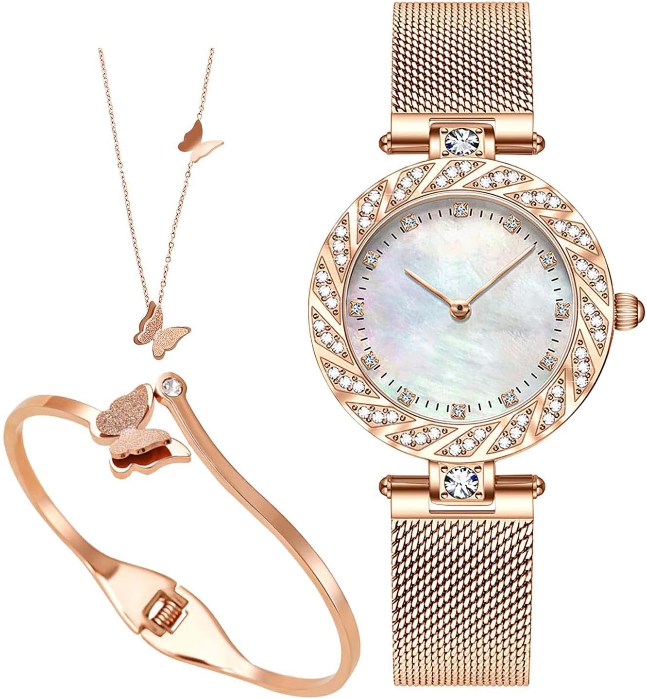 Elegant Women Watch Set, 3 Pcs Lady Watches with Bracelet and Necklace Set, Analogue Quartz Diamond Watches with Stainless Steel Strap, Rose Gold Watch and Jewelry Set