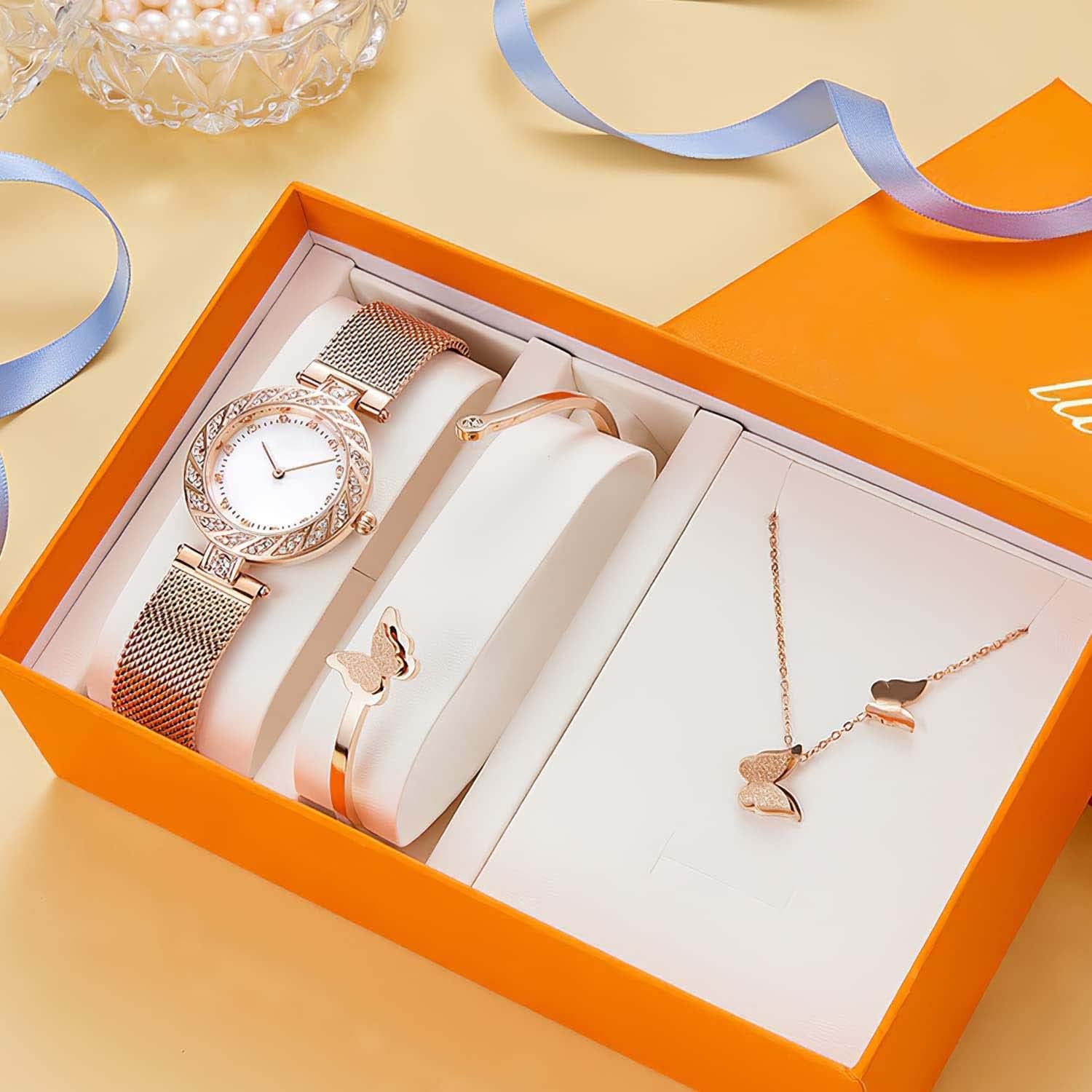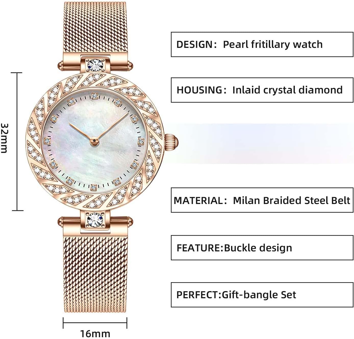 - đ -ăELEGANT UNIQUE LADIES WATCH SETăSimple design dial with mother-of-pearl and bling diamond scale and crystal outer bezel, clear time reading; matches with 3 crystal bracelets set, you also could alone wear bracelets and necklace according to your need.