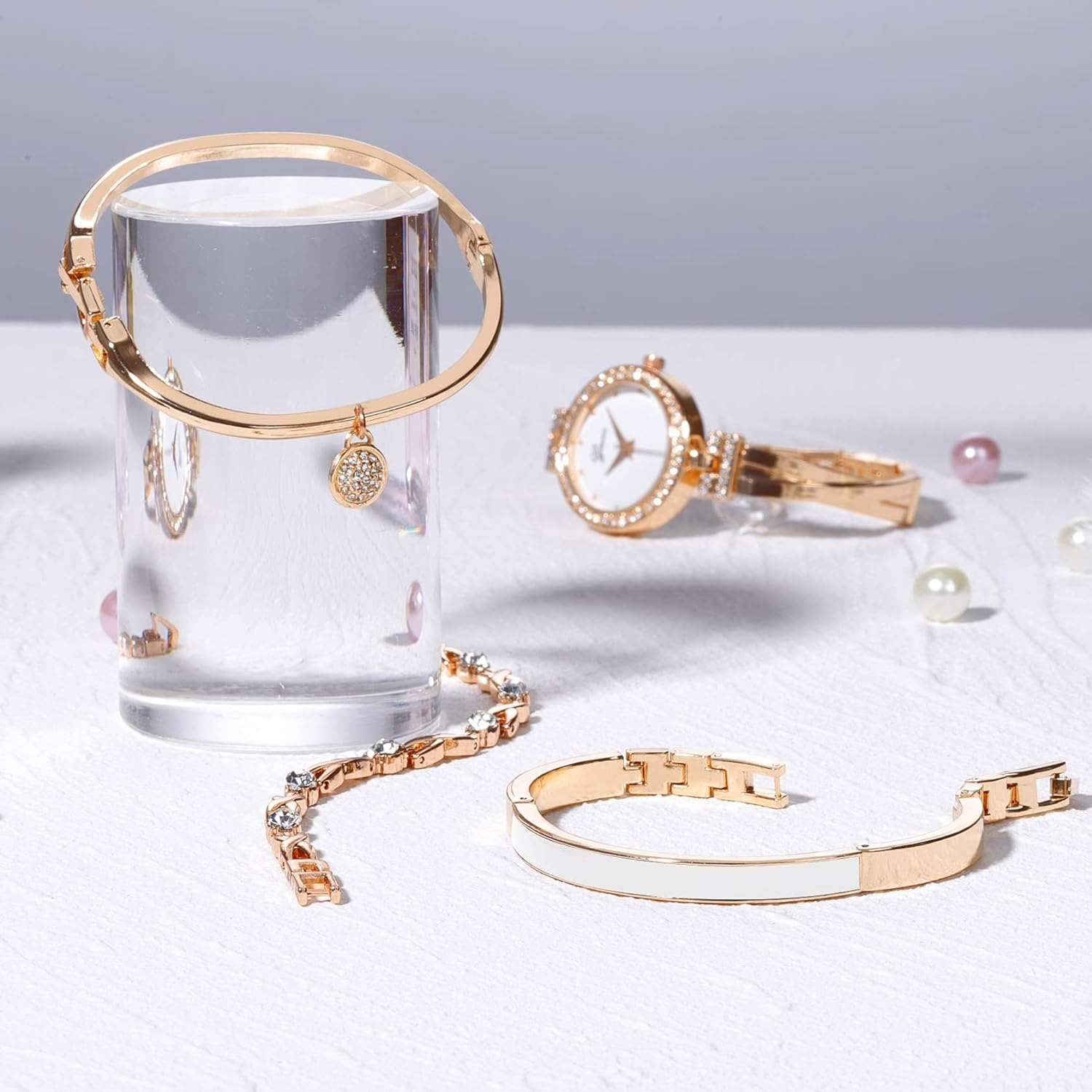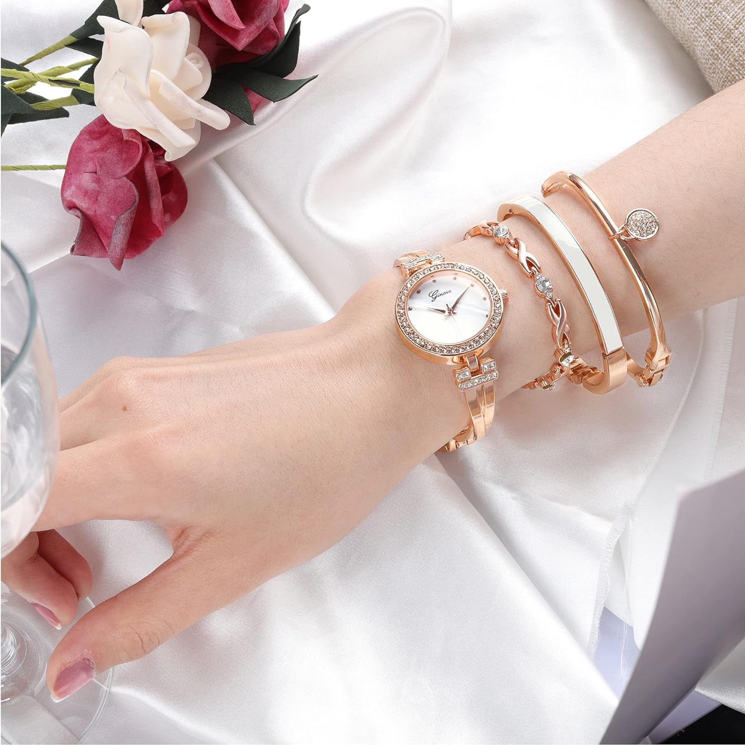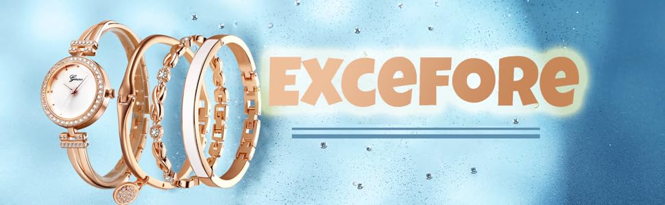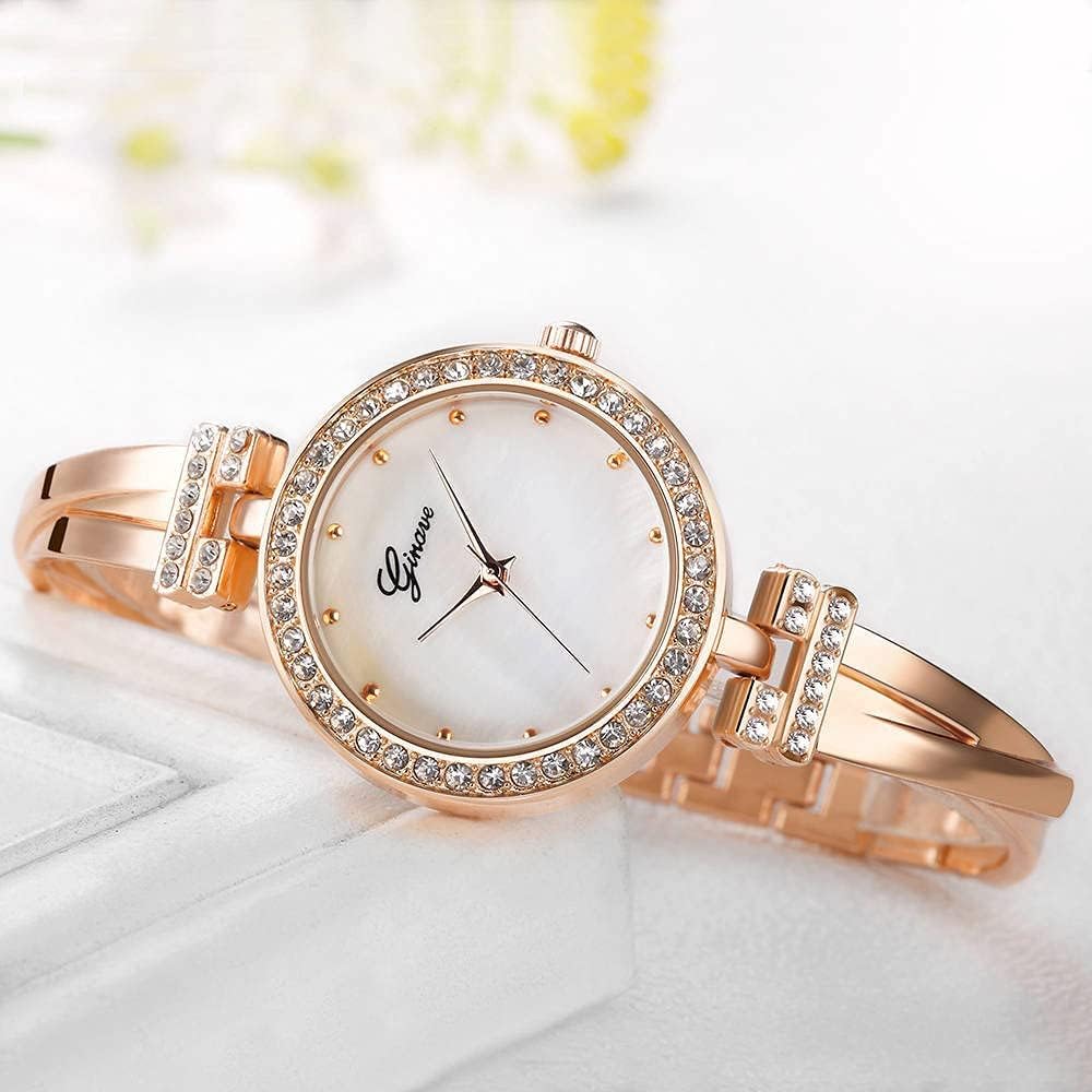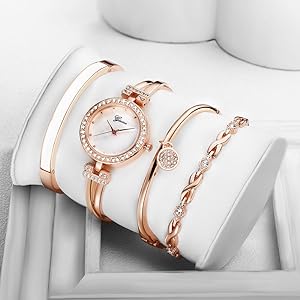 Excefore Elegant Women Watch Set, 4 Pcs Lady Watches with Bracelet Set, Analogue Quartz Diamond Watches with Stainless Steel Strap, Rose Gold Watch and Bracelet Set