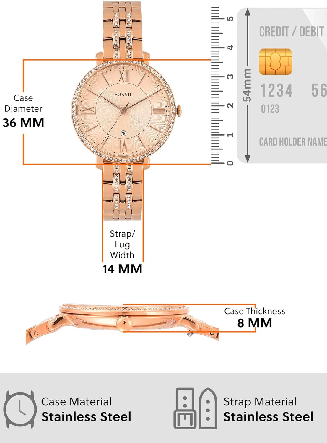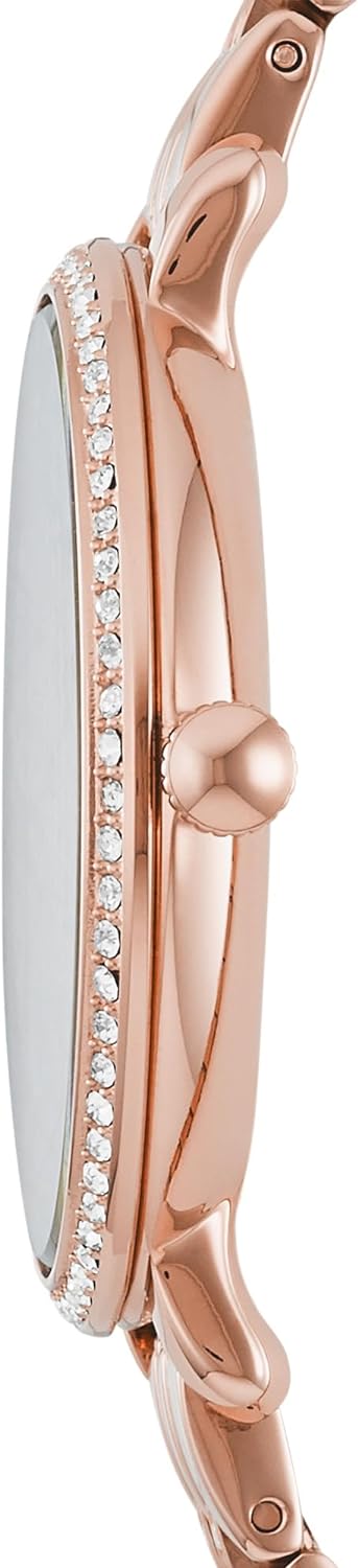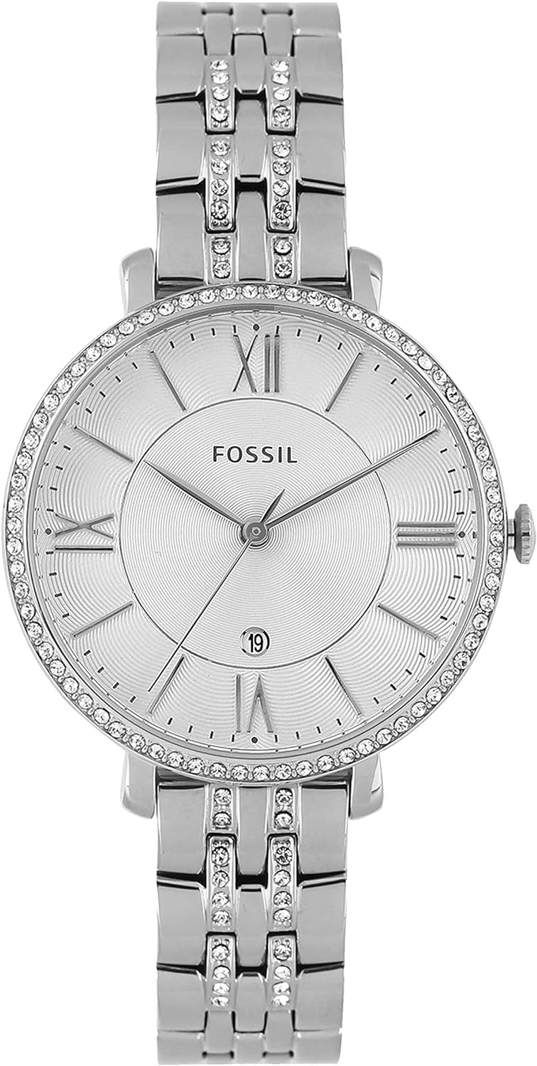 Watch Sizing GuideEvery gal needs a classic timepiece that she can turn to for all of her everyday needs. Let the Fossil® Jacqueline be your go-to watch!Stainless steel case.Rose gold-tone stainless steel bracelet features a fold-over clasp closure with push-button release.Round face.Three-hand analog display with quartz movement.Rose gold-tone dial features contrasting hour markers, Fossil branding, and a date display window.Water resistant 3 ATM/30 meters.Imported.Measurements: Case Height: 36 mm Case Width: 36 mm Case Depth: 7 mm Band Width: 12 7⁄10 mm Band Circumference/Length: 8 in Weight: 1.1 oz