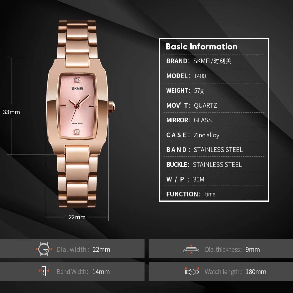 SKMEI brand has highly valued the excellent user experience for the buyer. We are committed to providing the best products, the flattest price, the best service. Fashion classic style, the unique design, Exquisite workmanship, high-quality material perfect for all kind of indoor and outdoor activities.Please look through all watch size carefully and combine with your wrist size when you buy it, for example, watch length, watch width, dial diameter, and another size.OUR SERVICE:If you have any questions or you don't know how to adjust the watch time and watch band of the designer watch, just don't be hesitate to send us an email. We will solve it for you no more than 24 hours.Product FeaturesFashion and casual style, show your personalityWatch for the hard surface of the coated glass and alloy waterproof case. leather strap with adjustable hole buckle claspThis watch with casual fashion dial analog display for women’s daily wearingSuper lightweight, adds no bulk or load to your wristHigh-Quality Quartz Movement: Japanese high precise quartz movement, provide precise and accurate time keepingWaterproof For Daily Use: The waterproof depth is up to 30M (Please Don’t Press Any Key Underwater)NotePlease DO NOT PULL OUT the Button Underwater. Use in extreme Hot or Cold temperature will shorter watch life.PackageWomen Quartz Watch ×1Original Watch Box ×1Instruction Manual ×1