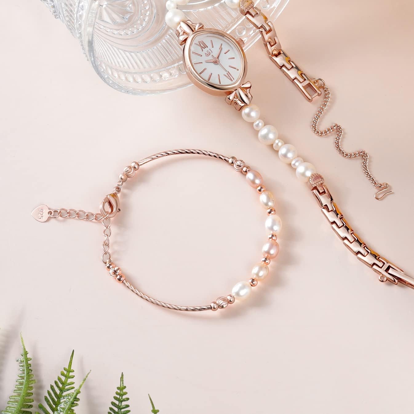 TERRIFI Watches Women Natural Pearls Watch and Bracelet Set for Girls Elegant Rose Gold Ladies Dress Watch Set Stylish Oval Dial Wrist Watches with Pearl Bracelet