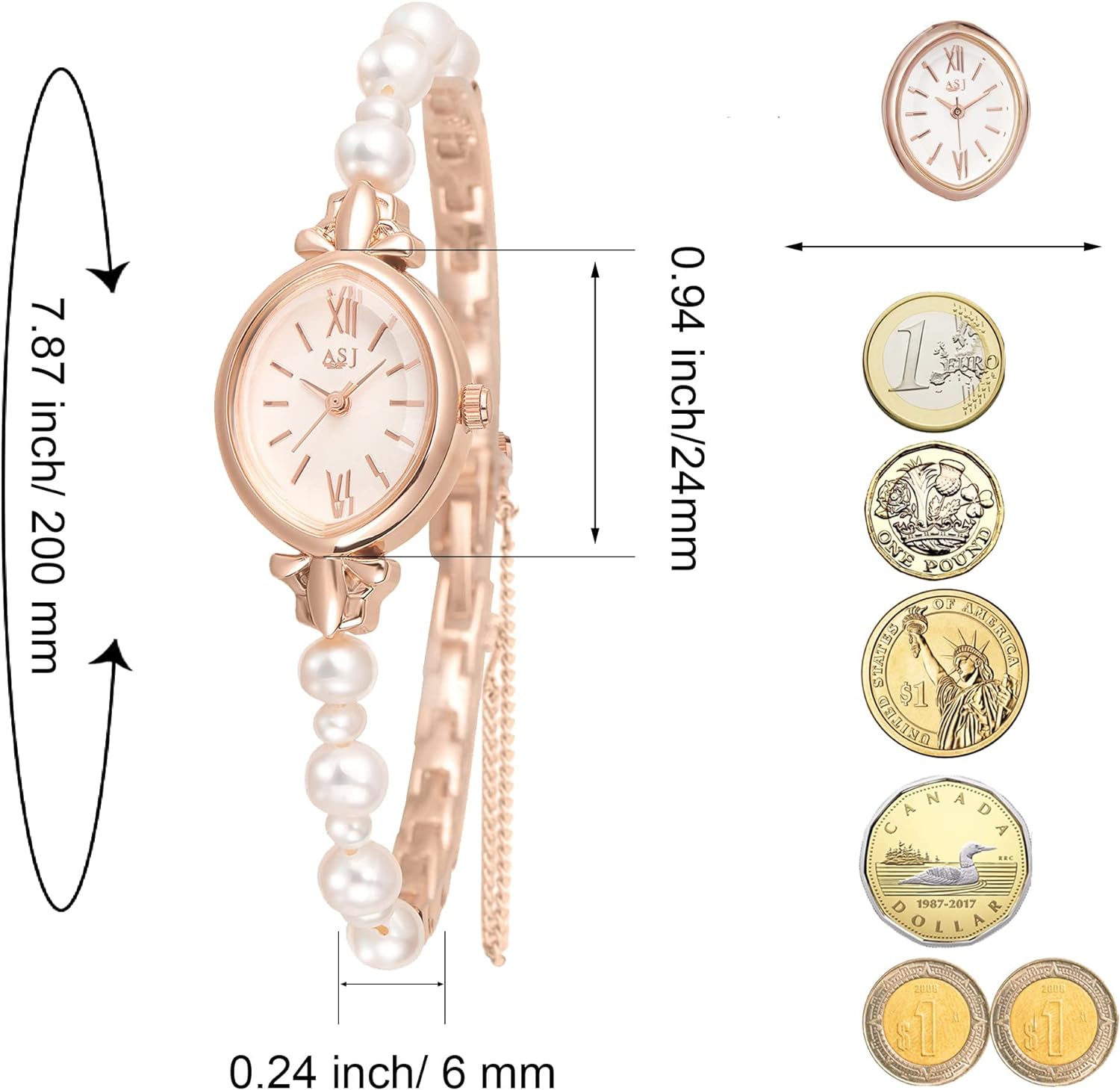 - 💗 Ladies Watch with Pearl Band: Case Size: 0.94 × 0.75 inch, Case Thickness: 0.31 inch, Band Width: 0.24 inch, Band Length: 7.87 inch, Adjustable; Bracelet Diameter: 2.36 inch; Weight: 1.05 oz
