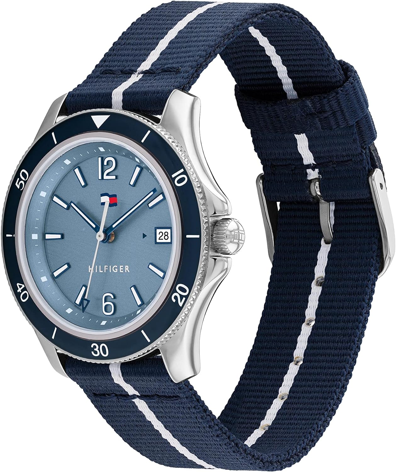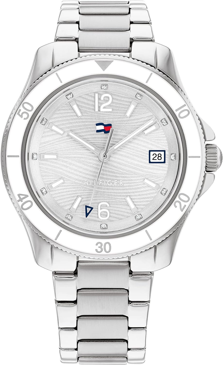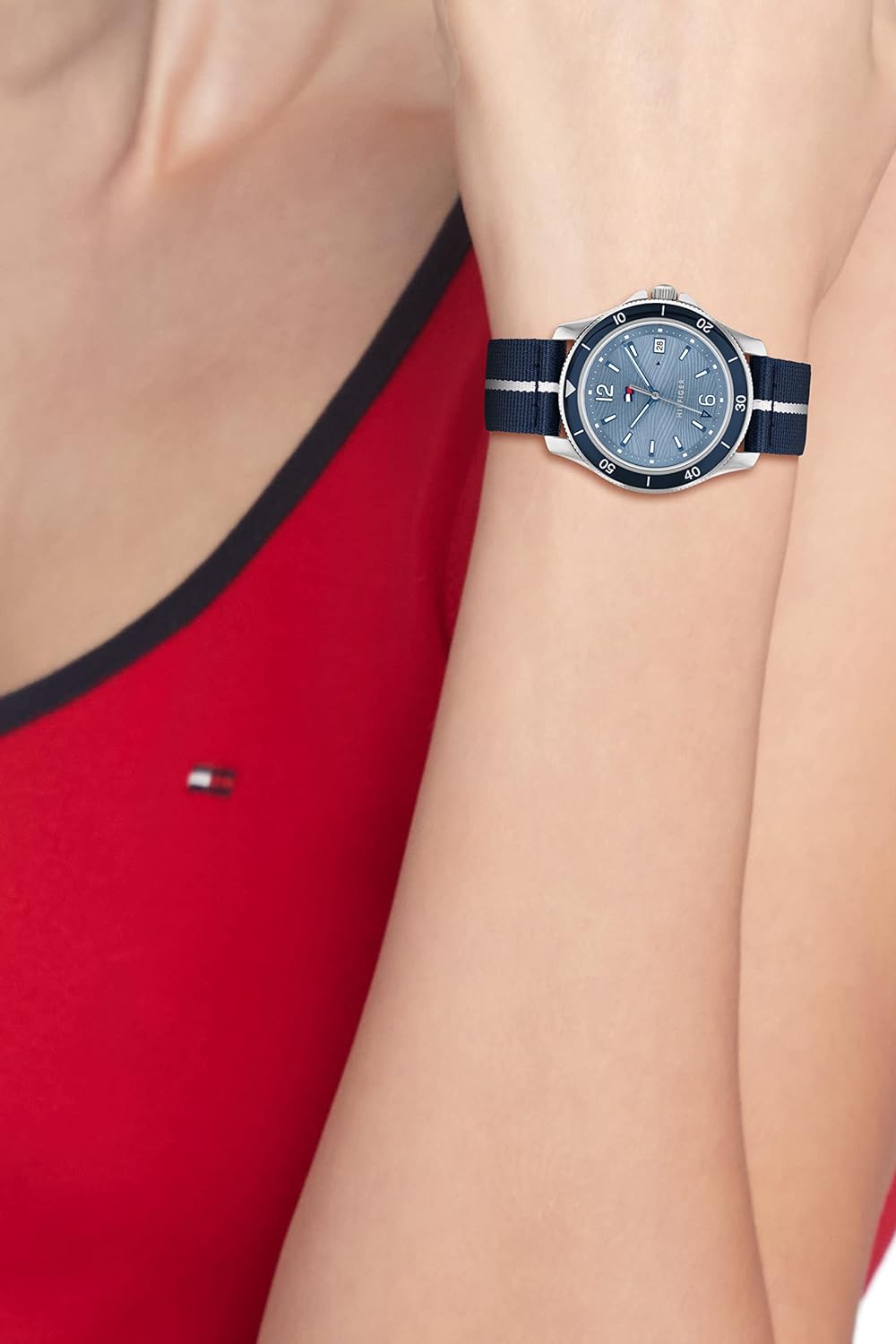 • Tommy women’s watch in the DIVER tradition. The elegant wave textured dial brings a fun nautical element perfect for the Summer. New wave TH Flag with date window on link Bracelets, Silicone & Sustainable Straps. 3H, 36MM