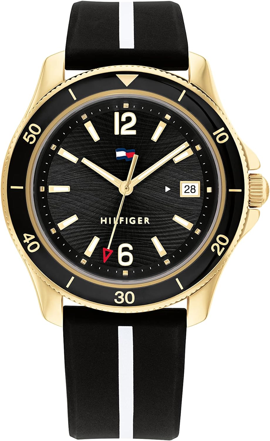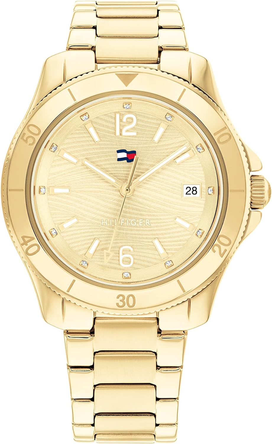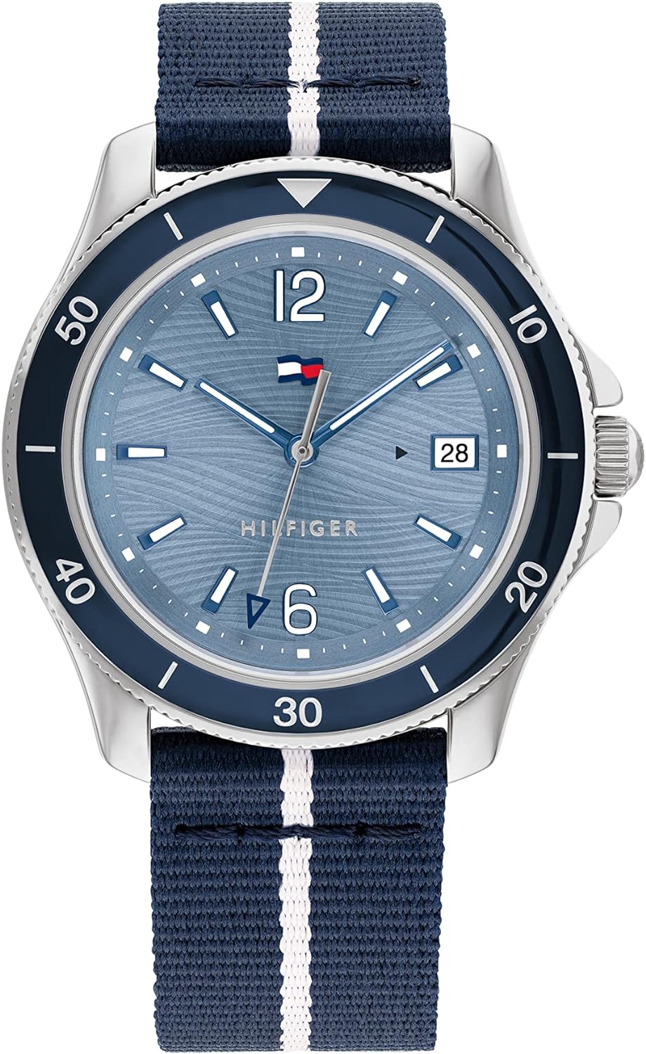 • Tommy women’s watch in the DIVER tradition. The elegant wave textured dial brings a fun nautical element perfect for the Summer. New wave TH Flag with date window on link Bracelets, Silicone & Sustainable Straps. 3H, 36MM