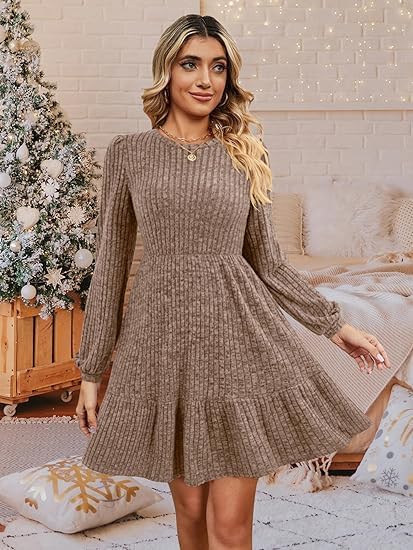 Women's Fall Long Sleeve Knit Sweater Dress Casual Crewneck Knee Length A Line Mini Babydoll Dresses 2023