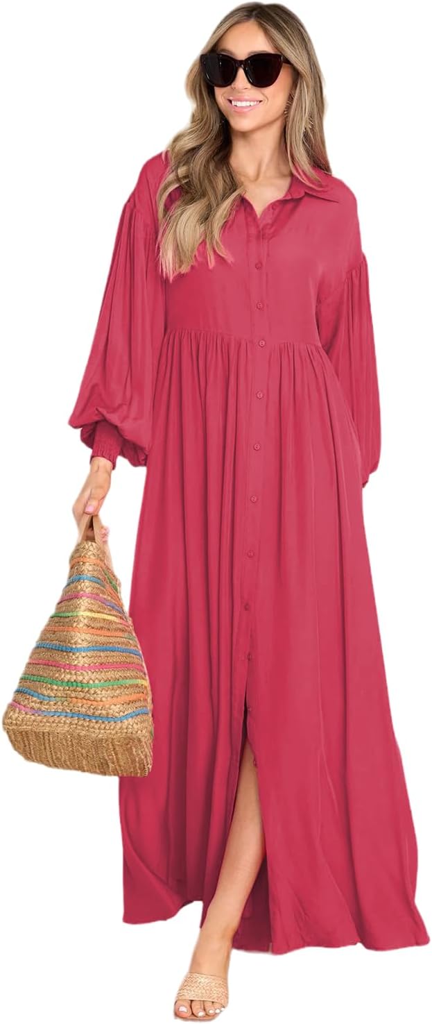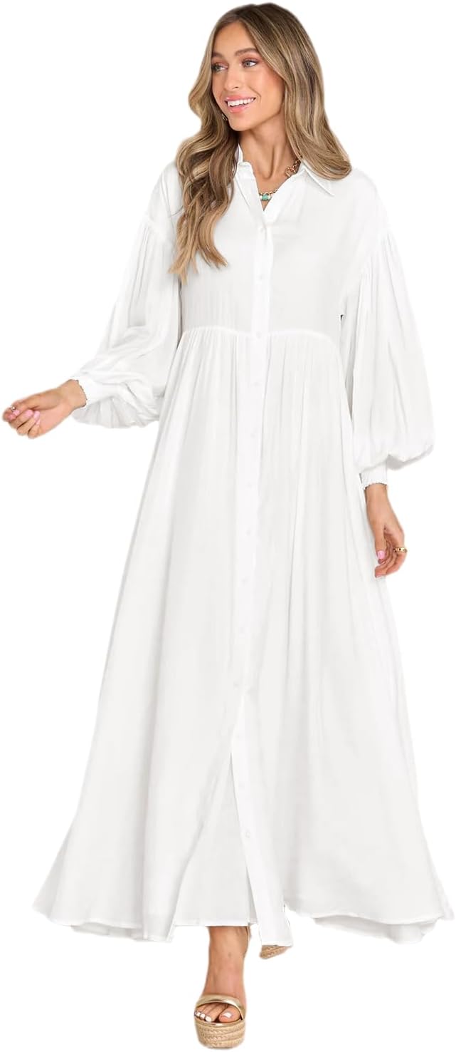 Women's Maxi Shirt Dress Button Down Long Sleeve Casual Flowy A-line Long Dress