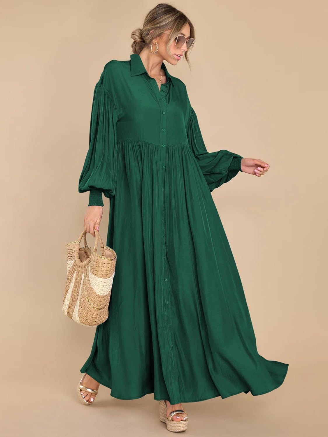 Women's Maxi Shirt Dress Button Down Long Sleeve Casual Flowy A-line L – BUYO