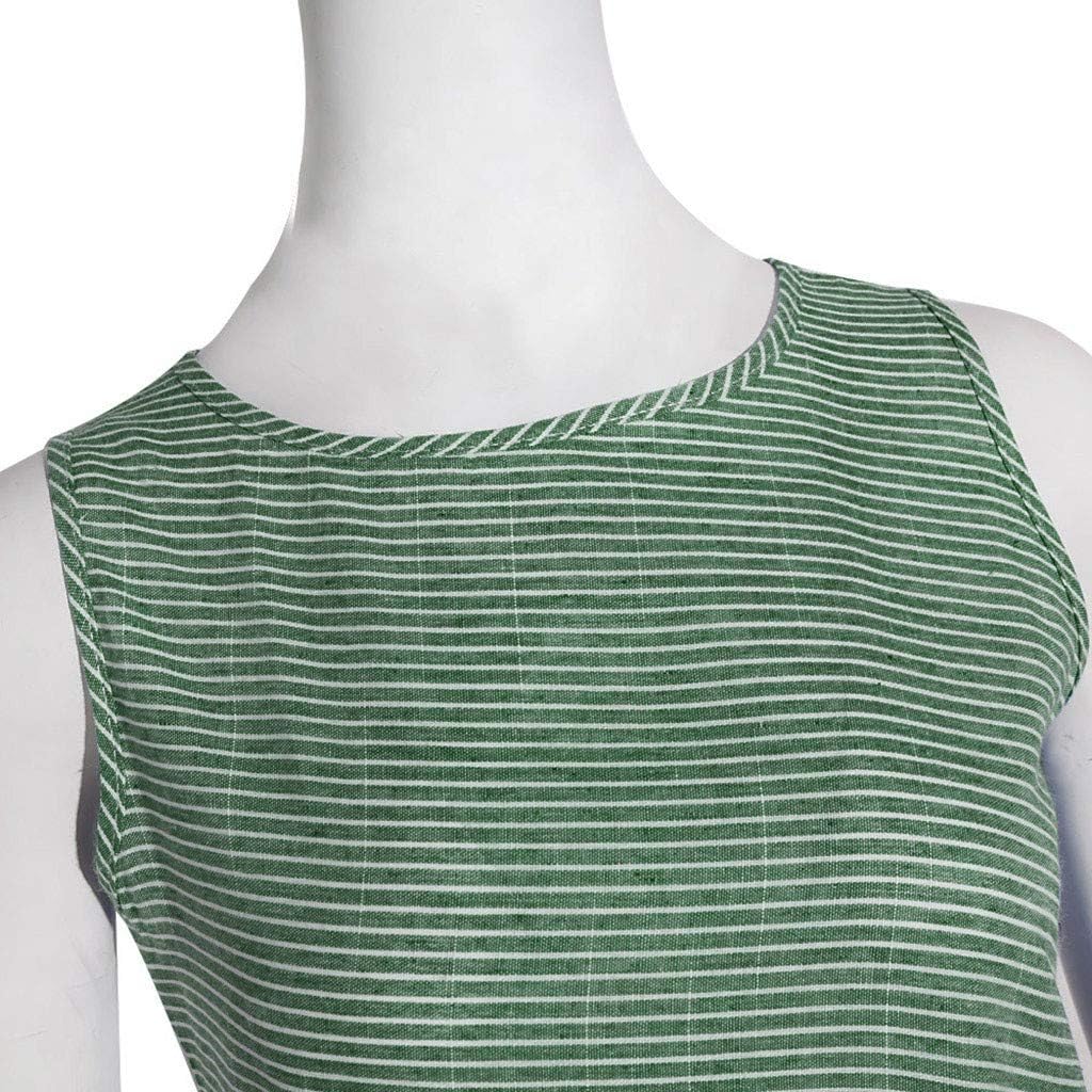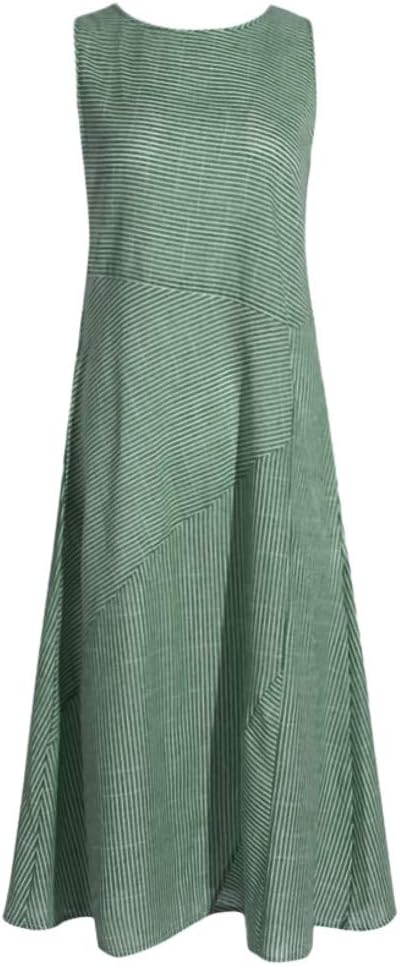 Women Casual Striped Print Sleeveless Dress Crew Neck Linen Pocket Long Dress - M