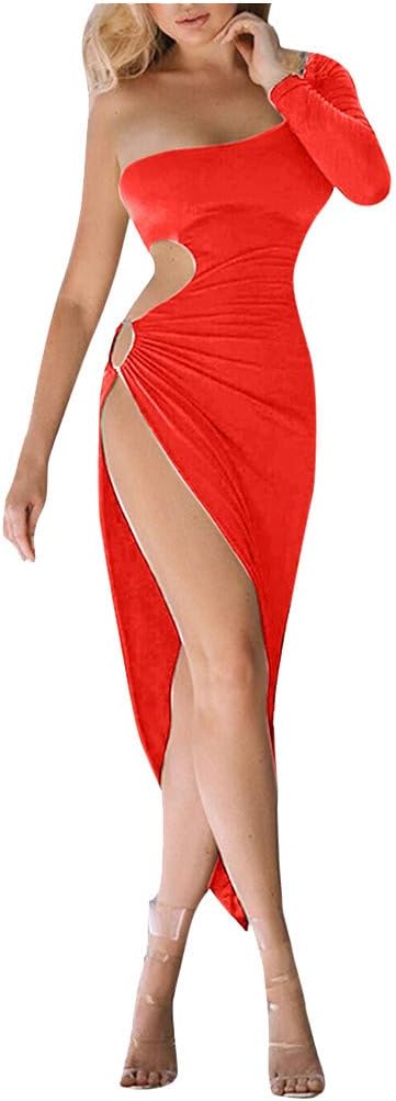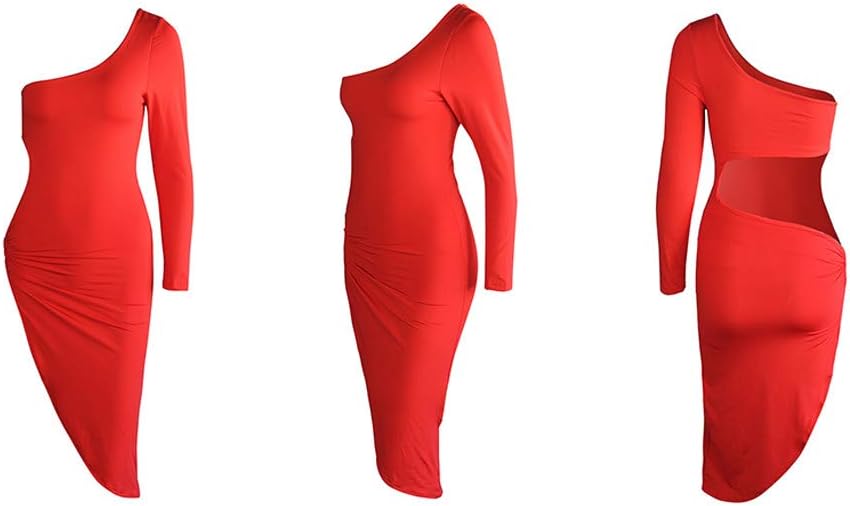 Women Sexy Party Evening Dress, Ladies Solid One Shoulder Hollow Out S – BUYO