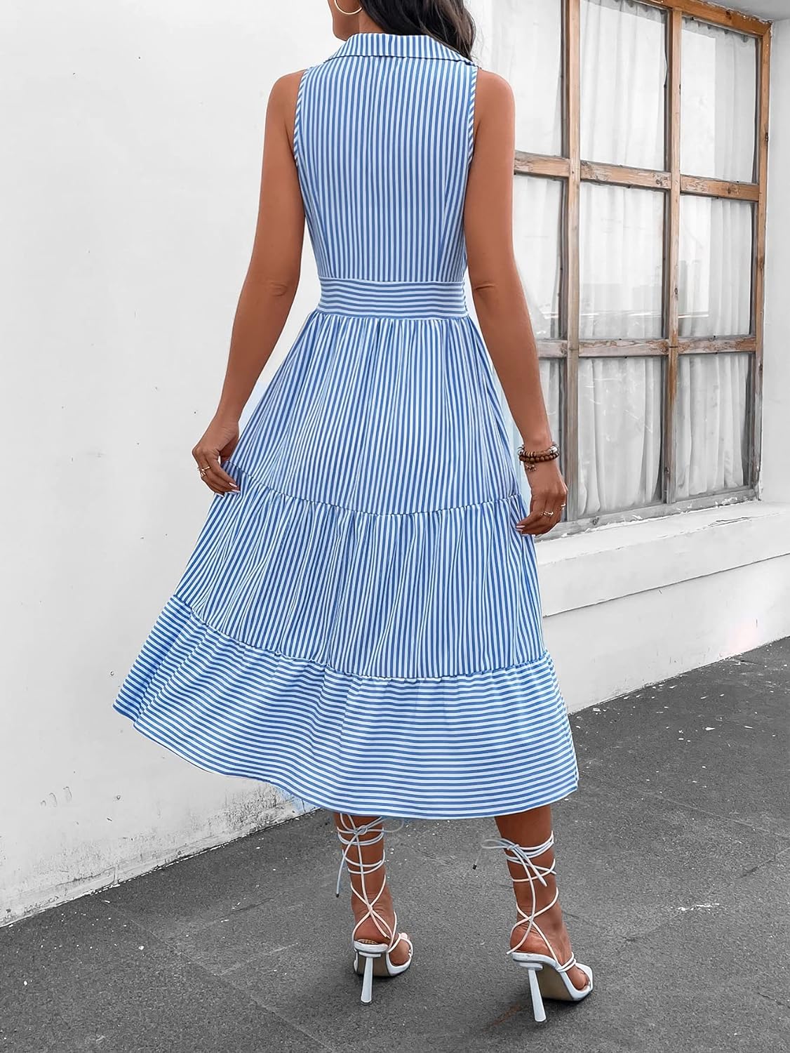 GORGLITTER Women's Casual Striped Print High Waist A Line Ruffle Hem Long Dress