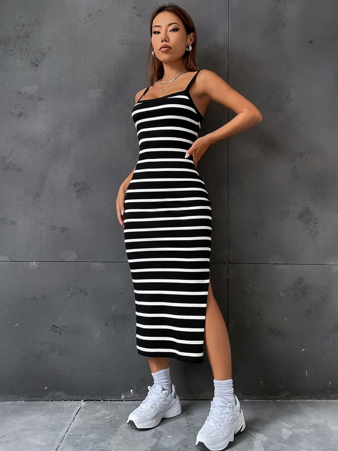 - Features: Stripe pattern, scoop neck,slit thigh, spaghetti strap, slim fit, knit fabric, sleeveless cami dress