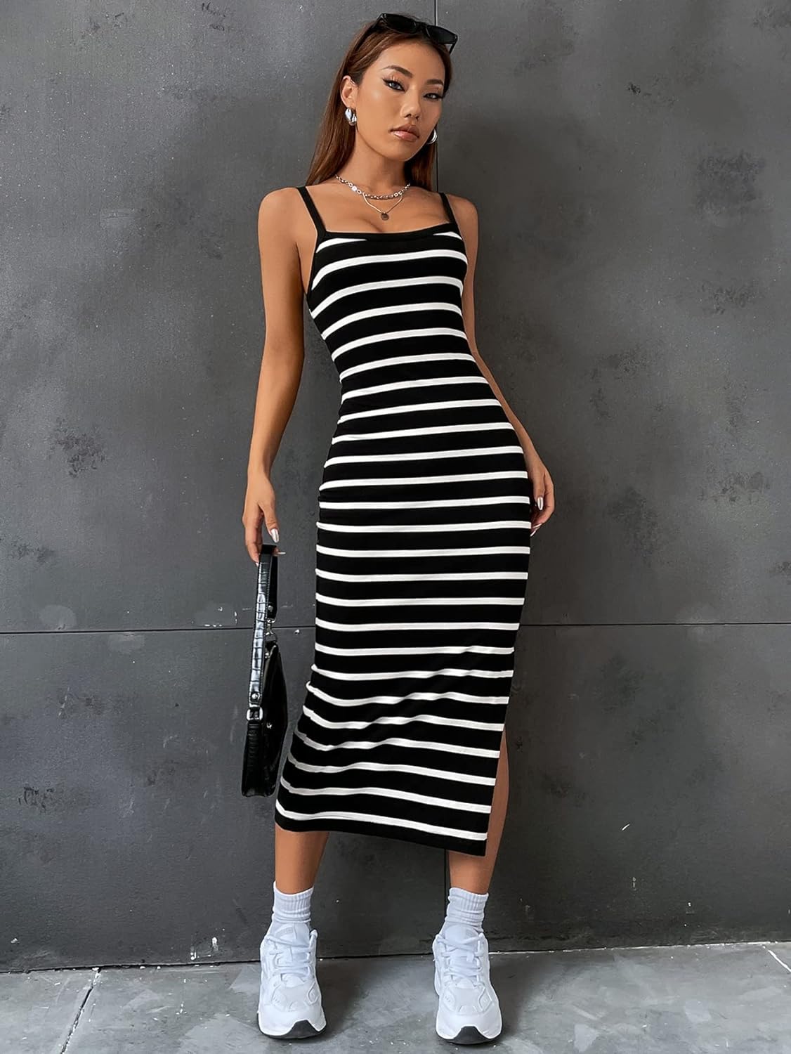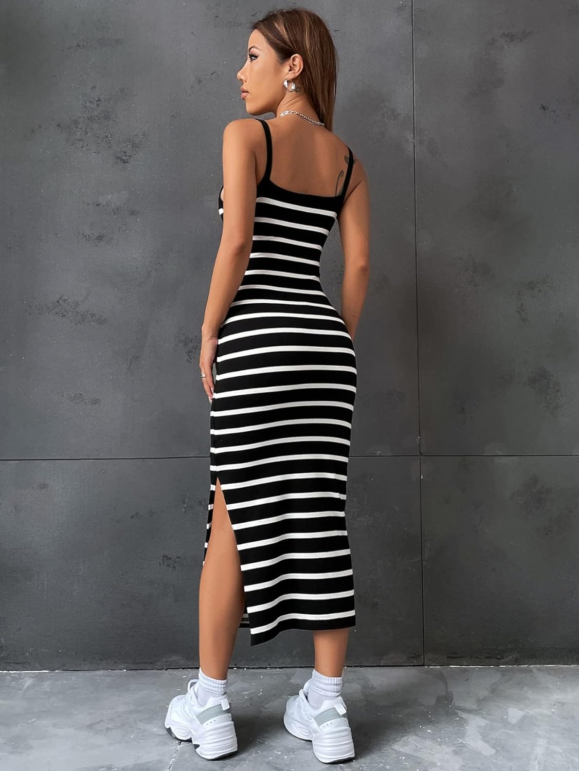 GORGLITTER Women's Striped Print Split Thigh Slim Fit Knit Sleeveless Cami Maxi Dress