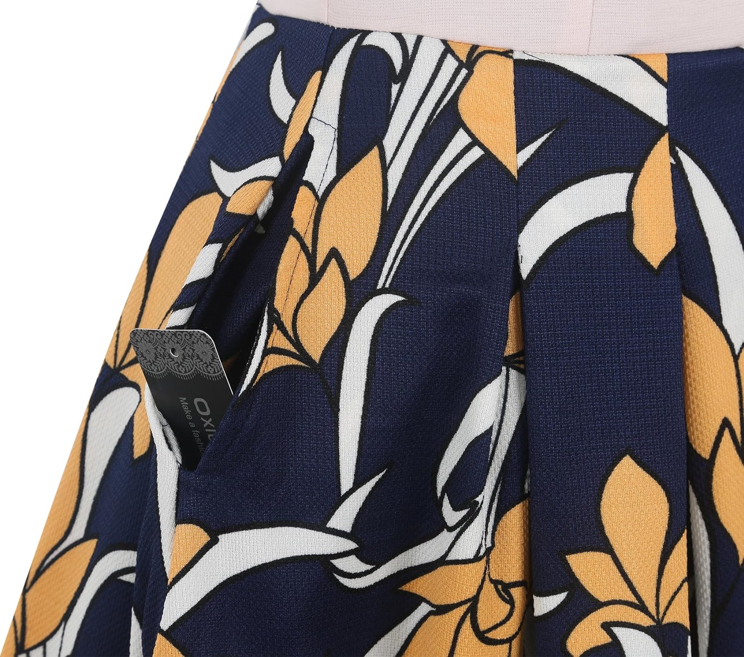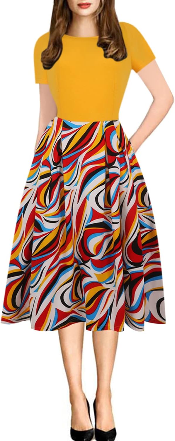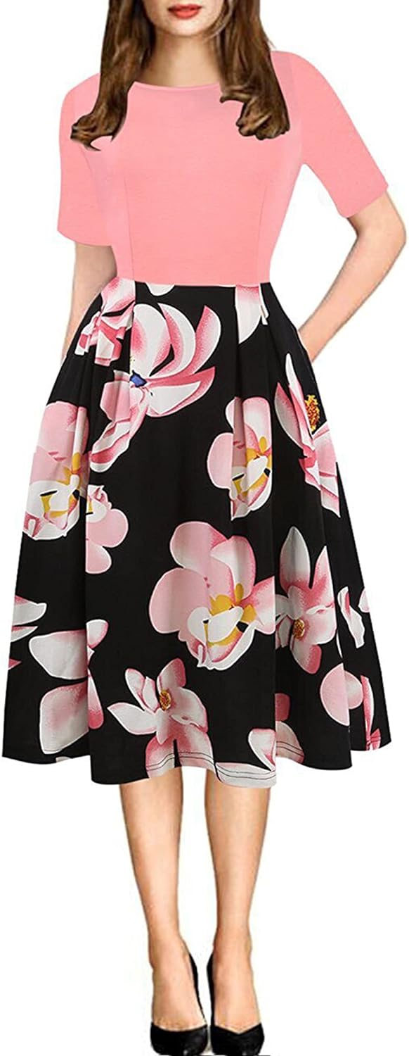 - Women's Vintage Patchwork Pockets Puffy Swing Casual Party Dress O-Neck,Ball Gown,Fit and Flare.This dress have pockets in side.