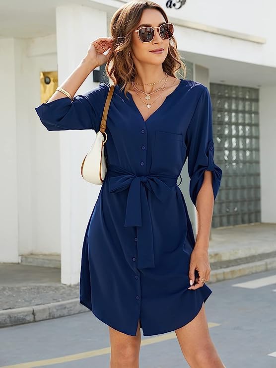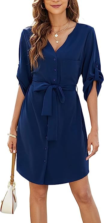 Womens Button Down Dress Summer V Neck 3/4 Sleeve Tie Waist Business Casual Work Mini Shirt Dresses