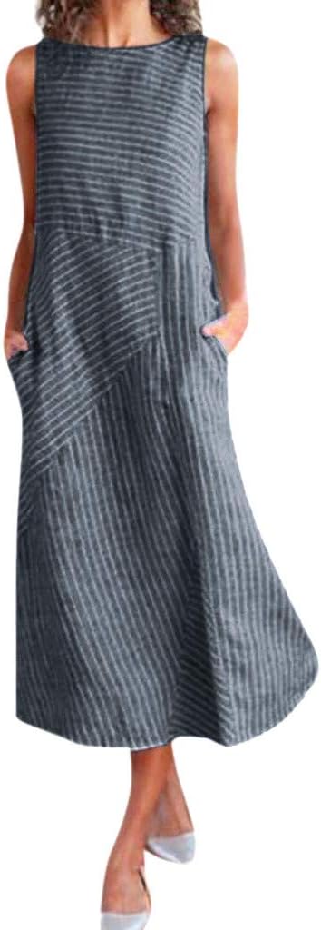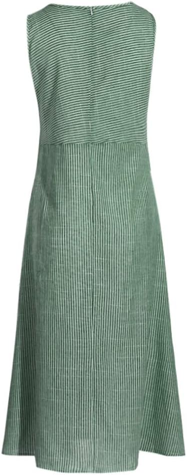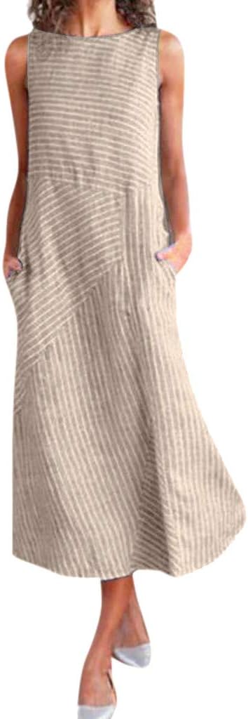Women's Cotton Linen Maxi Dresses | Striped Print Sleeveless Long Dress with Pocket Crew Neck Casual Loose Party Dresses