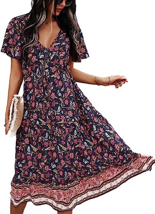 - Feature:Bohemian dress for women,V-neck,Floral printed,Bohemian style,Short sleeve,High waist,Not see throught,Belted.Knee length dress for women,long dress,midi bohemian dress,flowy dress,maxi dress.