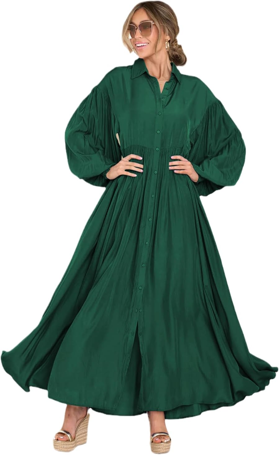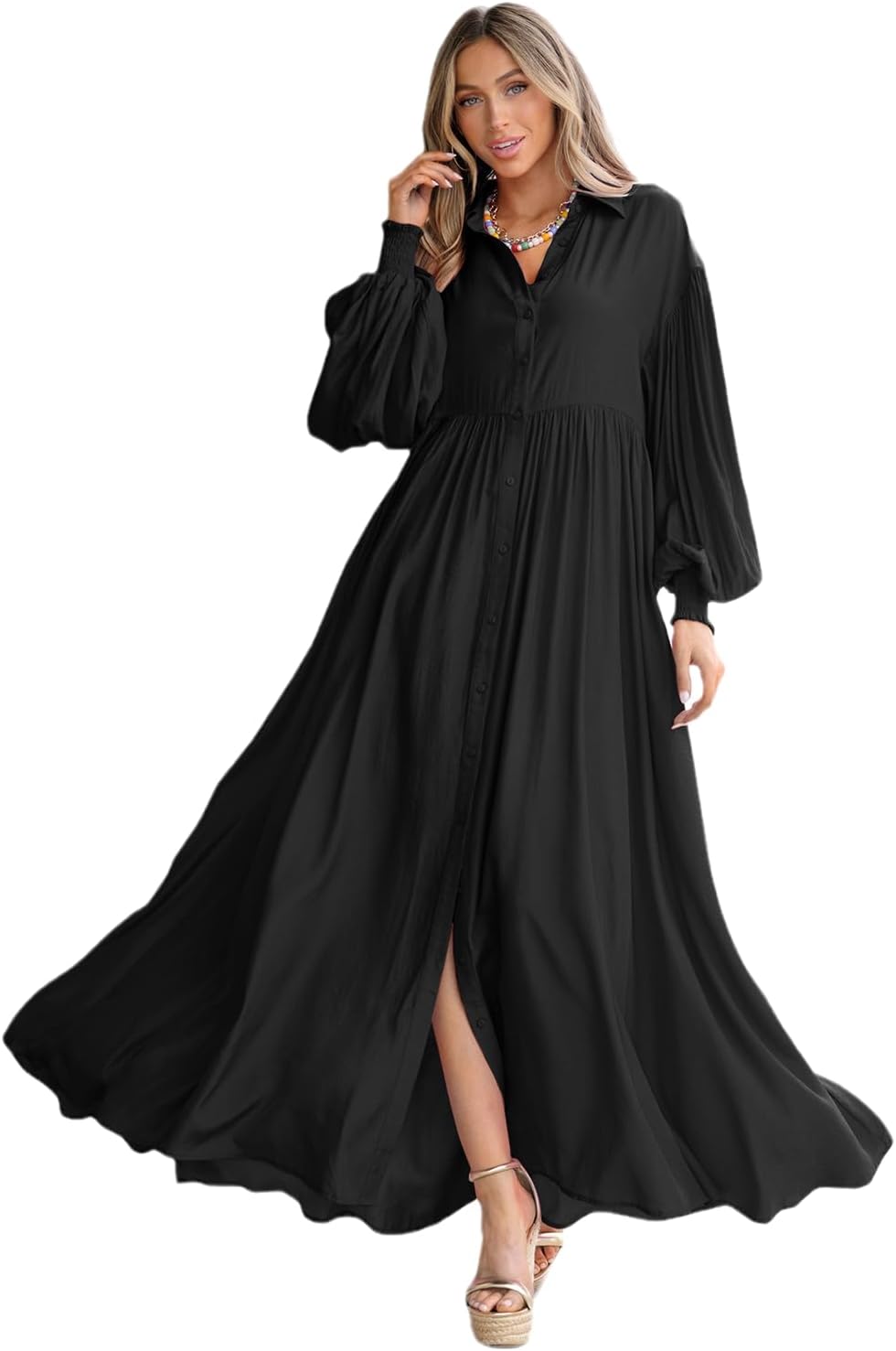 Women's Maxi Shirt Dress Button Down Long Sleeve Casual Flowy A-line Long Dress