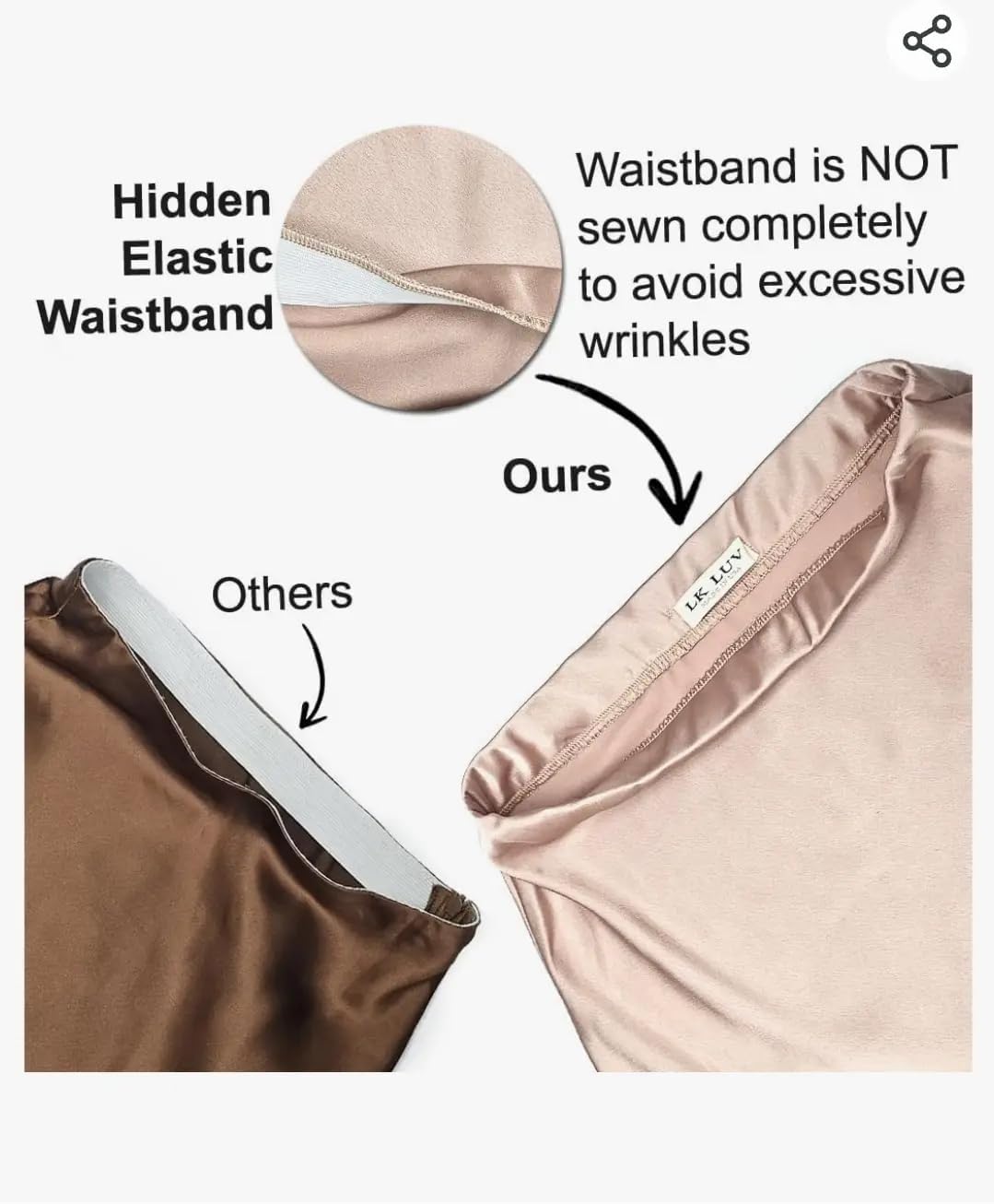 - Note: Please understand that the waistband is designed as it is to maximize the beautiful look/fit of the satin fabric. Any additional sewing would cause bad wrinkles as the fabric is very sensitive. Waistband is also hidden to avoid direct contact with your skin.