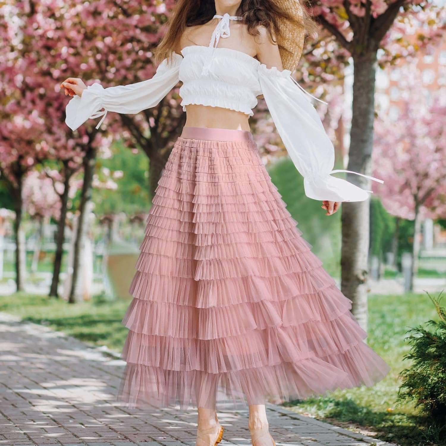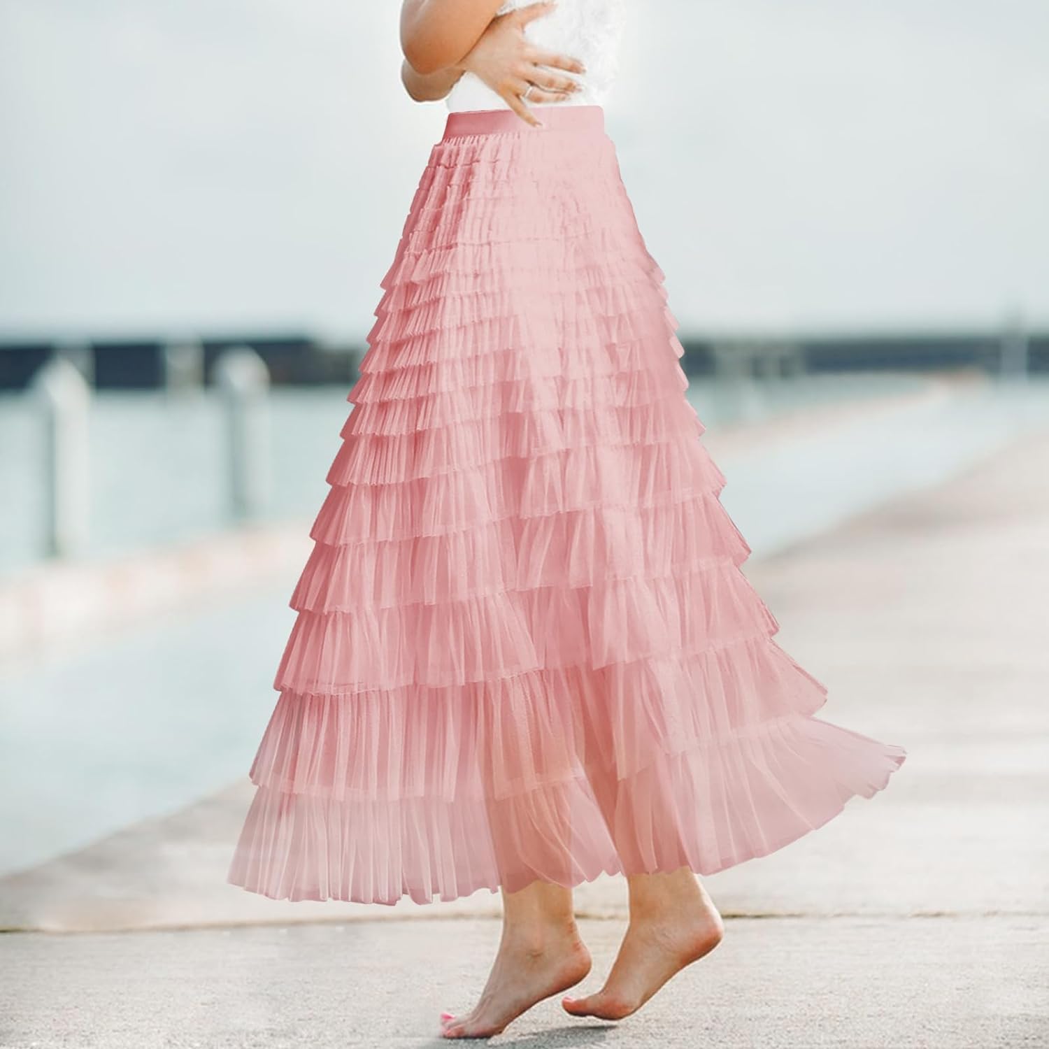 Women's Tulle Skirts 17-Layered Fairy Skirt A Line High Elastic Waist Midi Skirt Long Pleated Prom Party Skirt