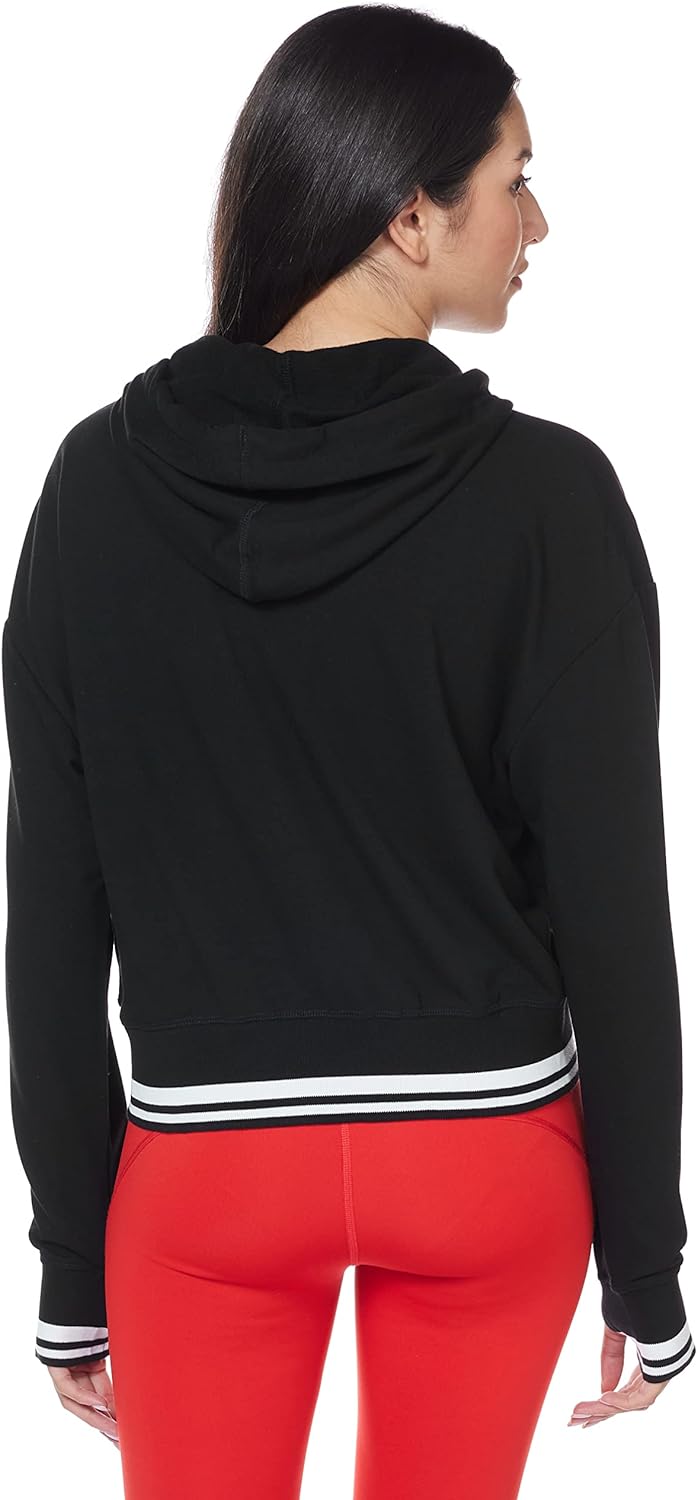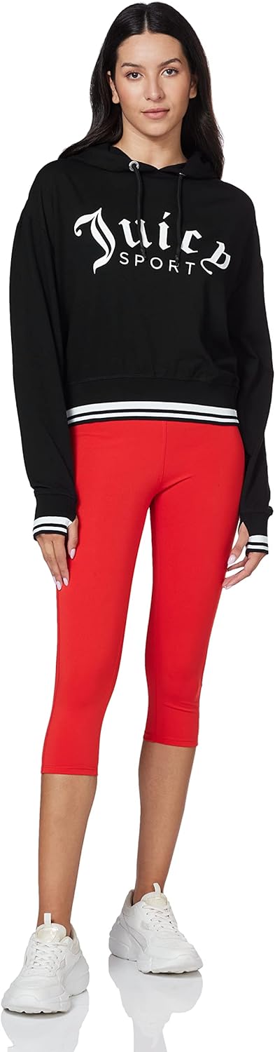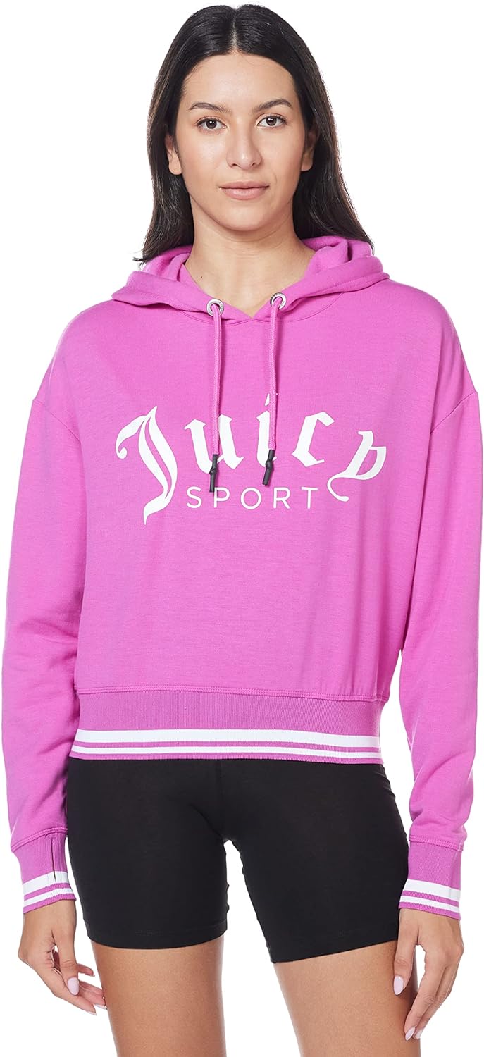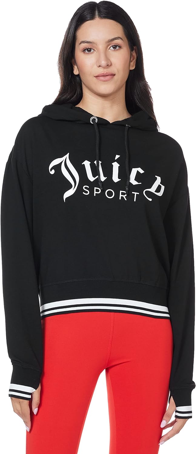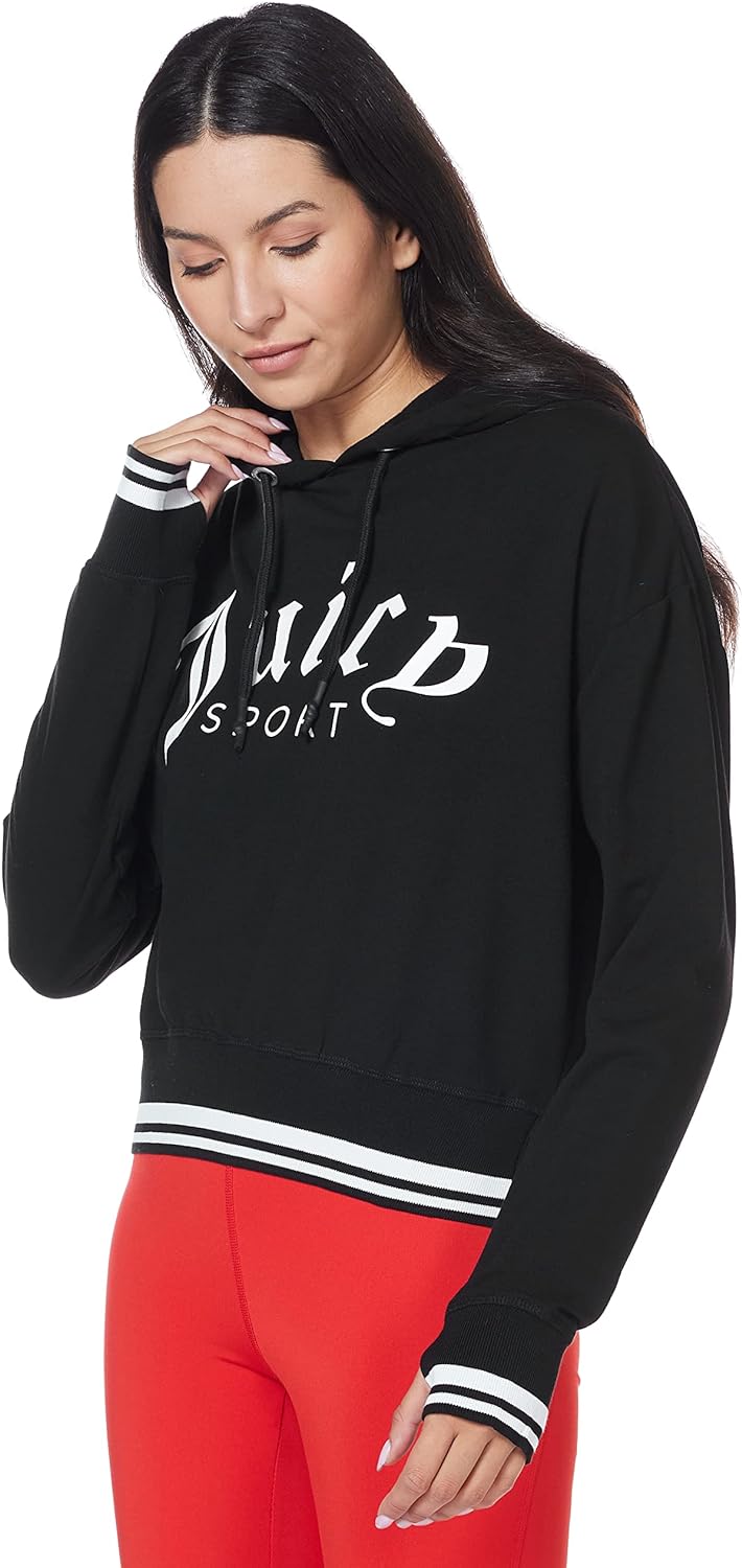 This Juicy Couture Active pullover hoodie is perfect for any type of workout or everyday use. Polyester/Rayon/Spandex french terry construction, long sleeves and a cropped length for a finished trendy look. Featuring a varsity stripe detail on the hem and cuffs, a front signature graphic logo, an adjustable drawcord with hood and thumbhole openings.